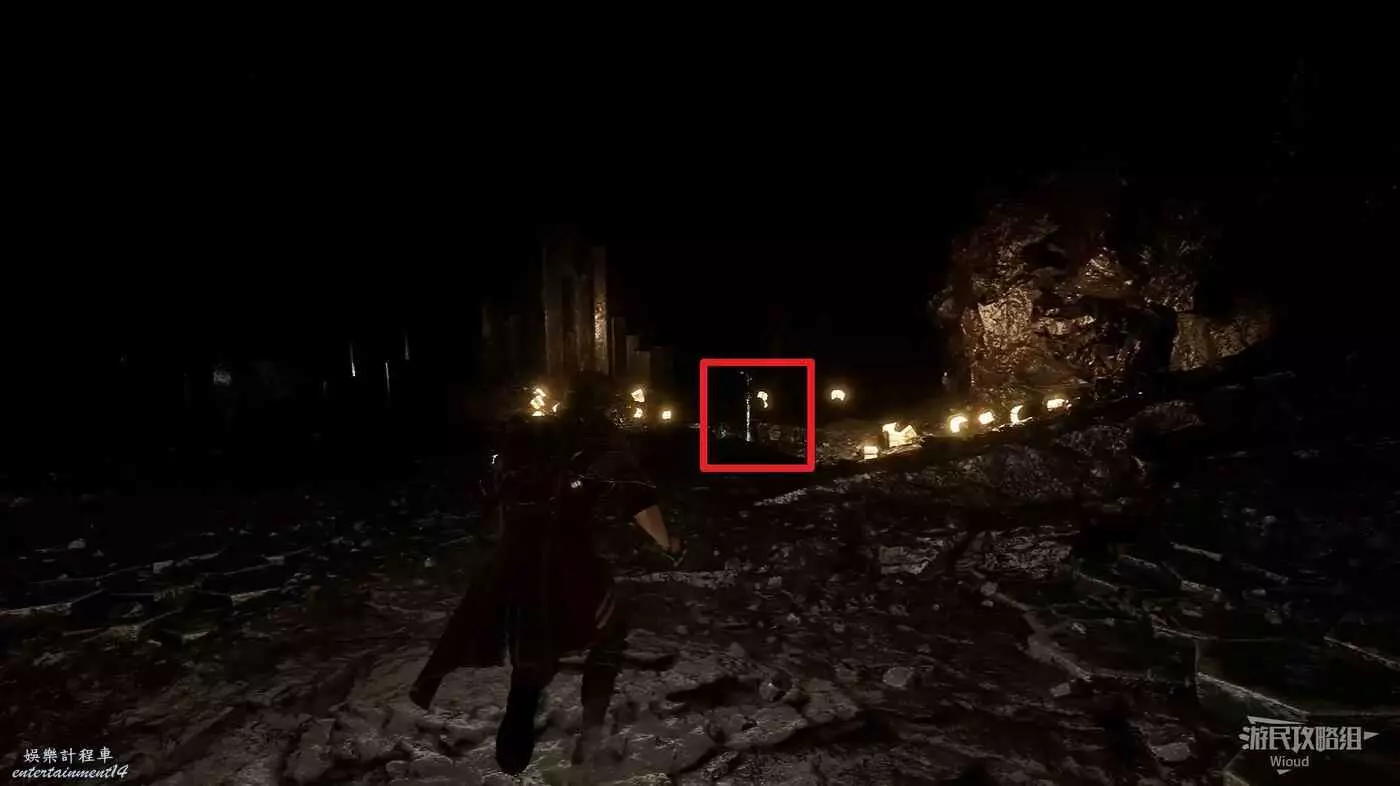 旗幟位置,沿著右側下坡走,路燈位置通過鉤爪跳到對面平台,往左走通過盡頭的繩索下去。