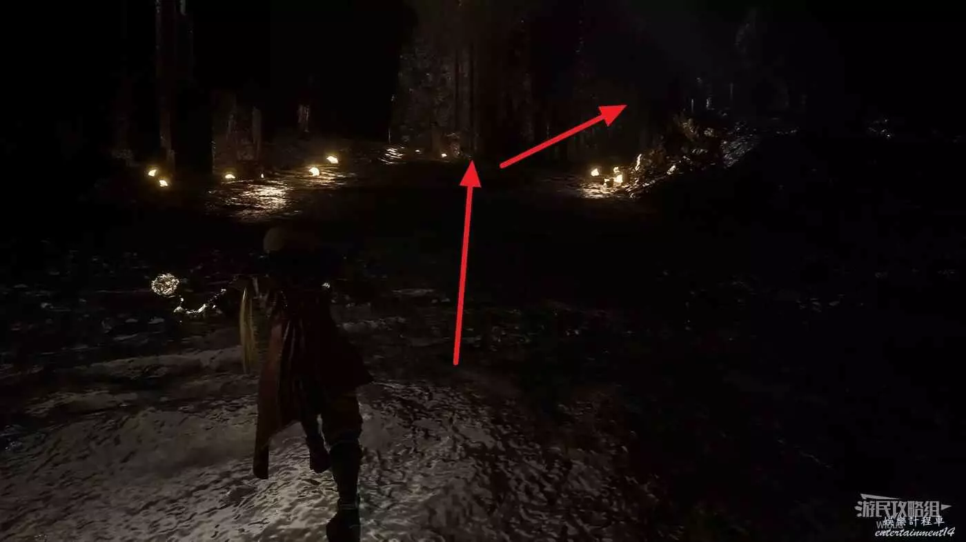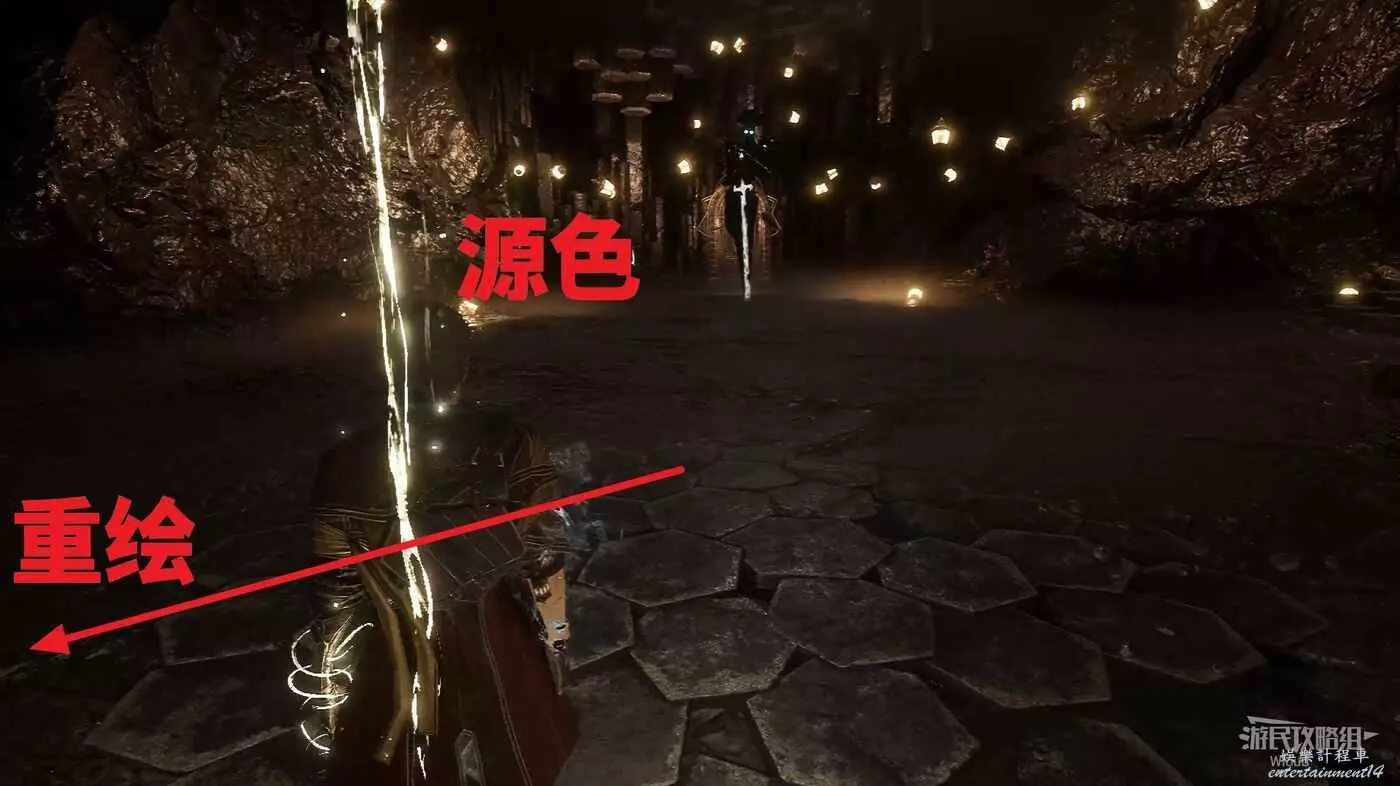 底部找到本地圖的宅邸入口,繩索位置左後方可以拾取道具【重繪】,前方敵人左後方可以拾取一些源色,將這個黑色敵人擊敗可獲得符紋【極限格擋】。