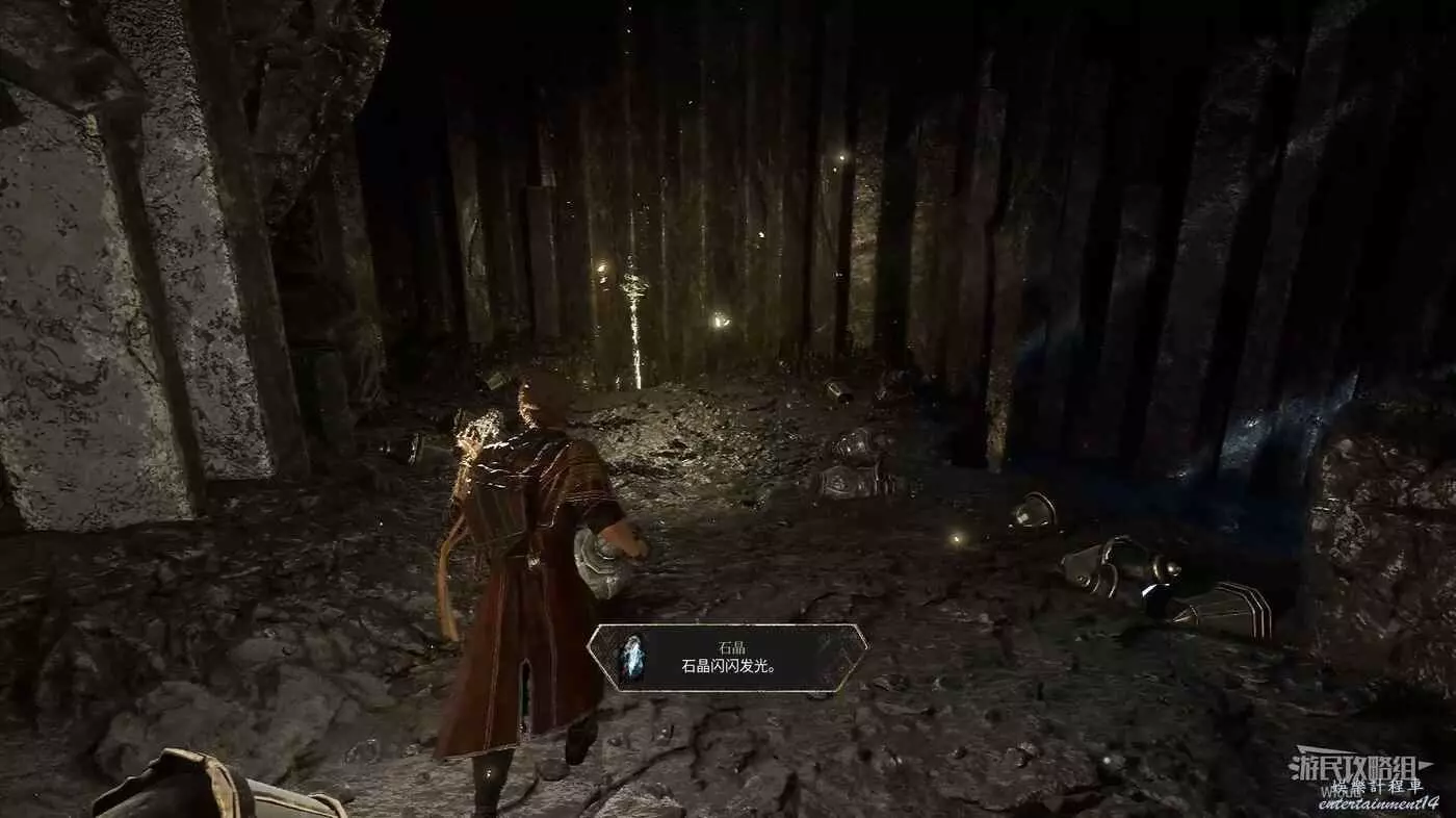 隧道左側可拿到一個【靈光色】,走到盡頭發現同樣散發藍色光芒的石晶,但這塊是怪物偽裝的,靠近就會觸發戰鬥,提前做好準備。