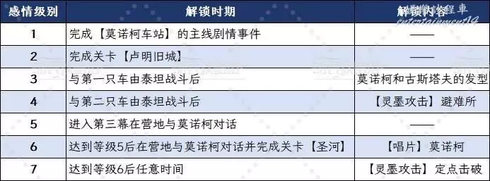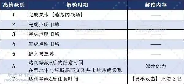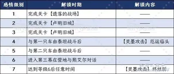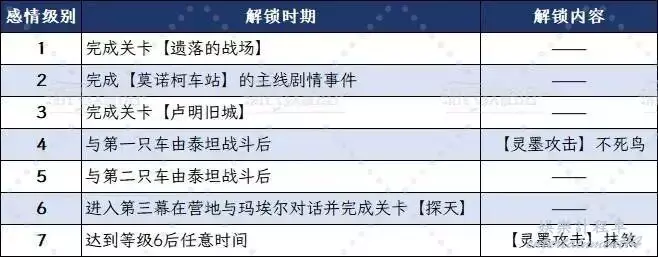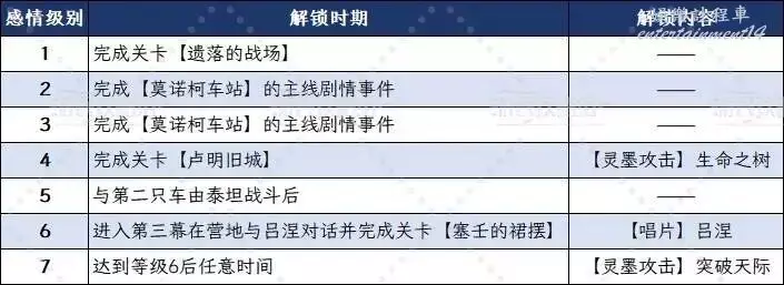 提升角色的感情級別可以解鎖該角色的靈墨攻擊(分別在等級4和等級7解鎖)。當第一幕結束【維爾索】加入隊伍後,即可與其他隊員建立關係,這些關係式通過維爾索的視角來體現的。也就是說在完成【遺落的戰場】(第二幕劇情關卡)之後才能真正開始與其他角色建立感情級別。通關【遺落的戰場】後返回營地,可以照常與同伴交談,交談完畢後會彈出一個提示詢問是否要和XXX獨自待一會兒。接受之後會與夥伴觸發好感度聊天,如果沒有說錯話,在聊天結束時就會提升感情級別。建議提前存檔以防選錯選項。