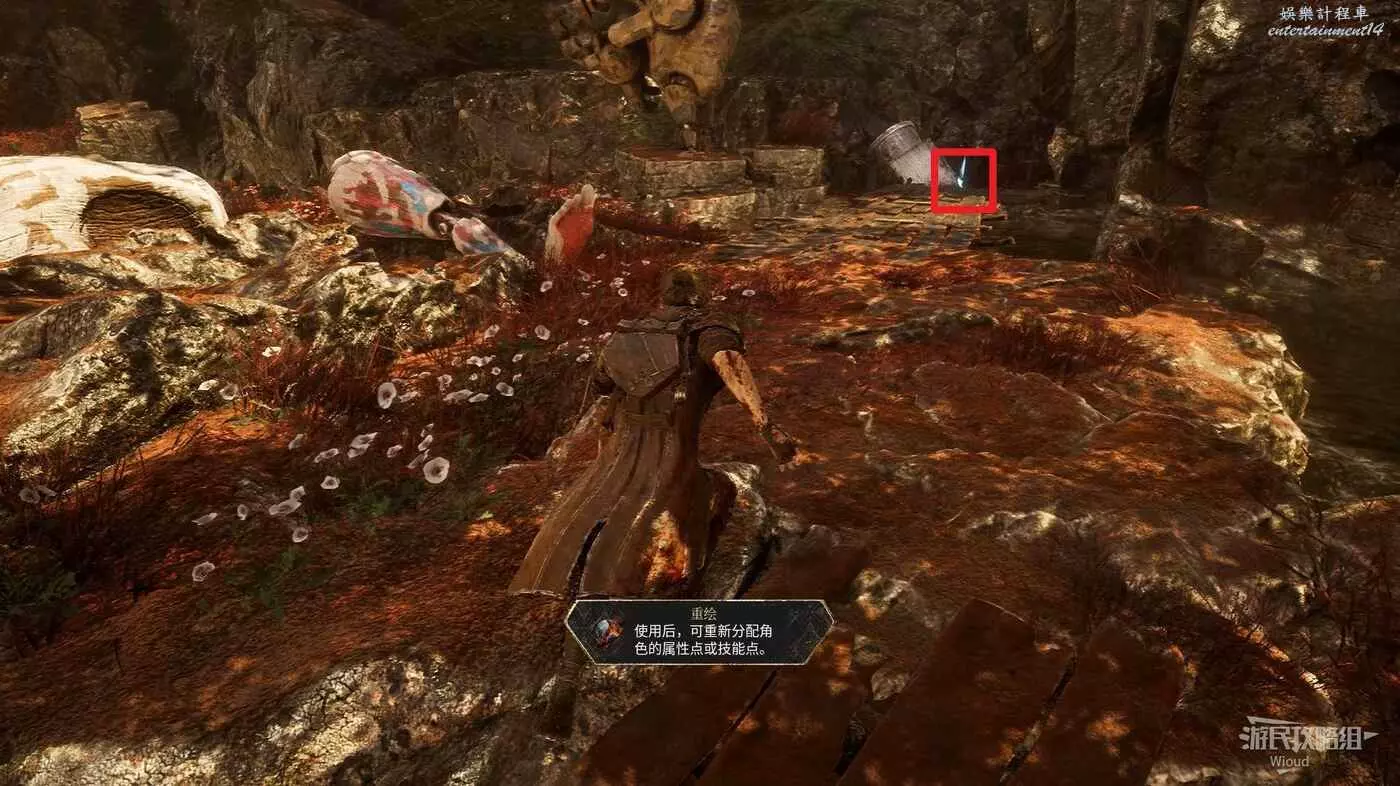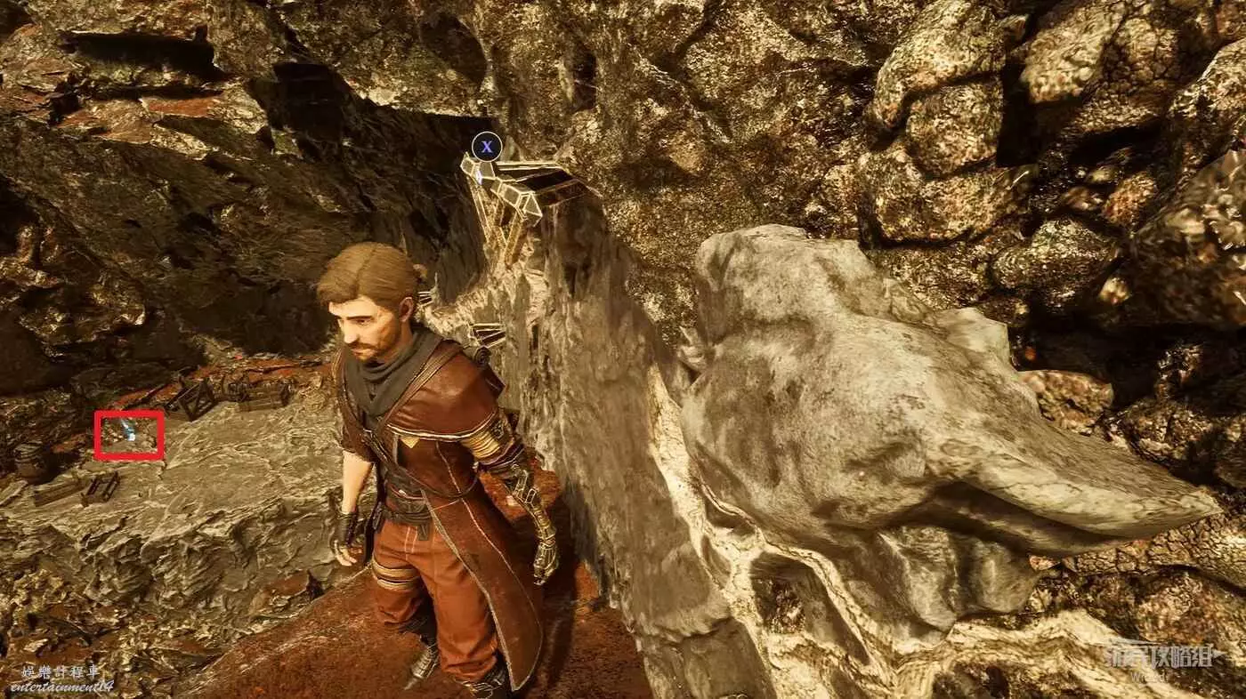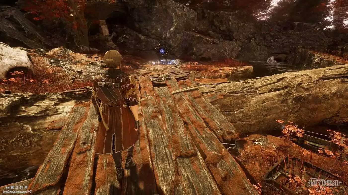 主路走到前方岔路口,先走左側下坡,盡頭爬機關到底部平台,拾取發光道具點可獲得符紋【引燃標記】。
