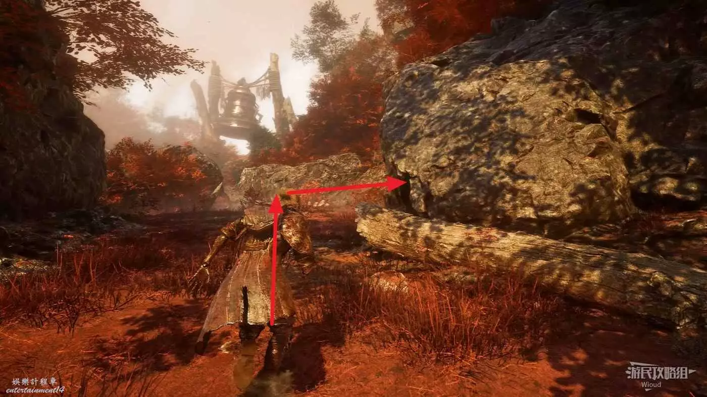 右側爬繩子上去,走到頭可以撿一個【靈光色】,然後跳到第一個遠征隊旗幟的位置,傳送到第二個旗幟再次走到狗洞T字路口,往左走。