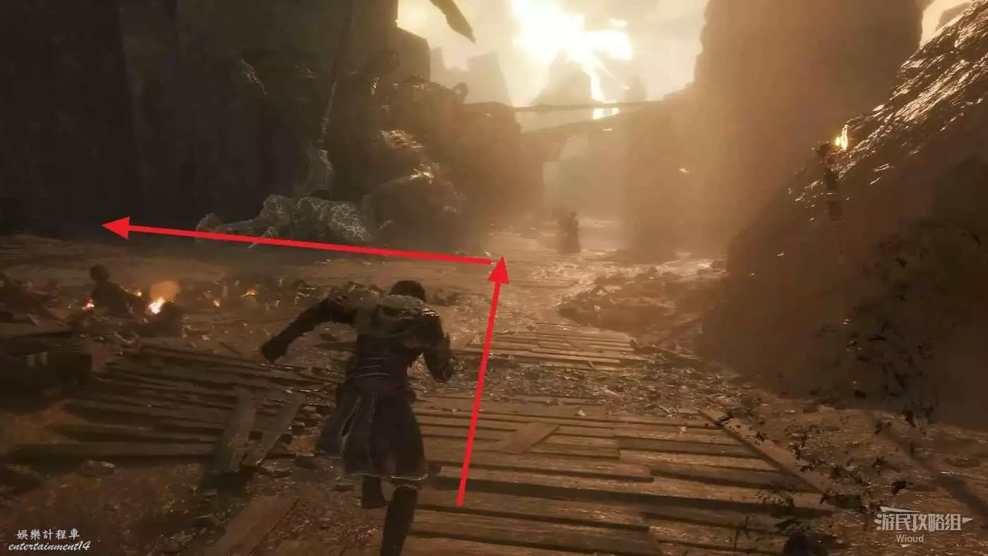 板塊處走右側小道,前方沿著左側木橋上去可拿到不少源色。