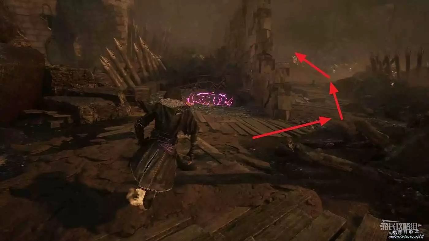 直走進入右側第一個過道,往左側木台上繞,角落爬繩索上去可撿到符紋【助力亮色】。