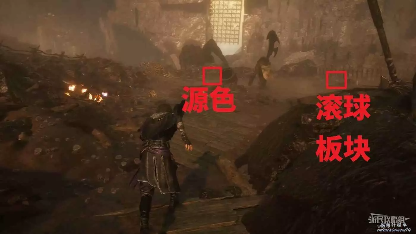 回到旗幟處,往前走到有個敵人巡邏的位置,左前方箱子處有源色可拿,然後繞到右側發紫的位置,是一個滾球的板塊。