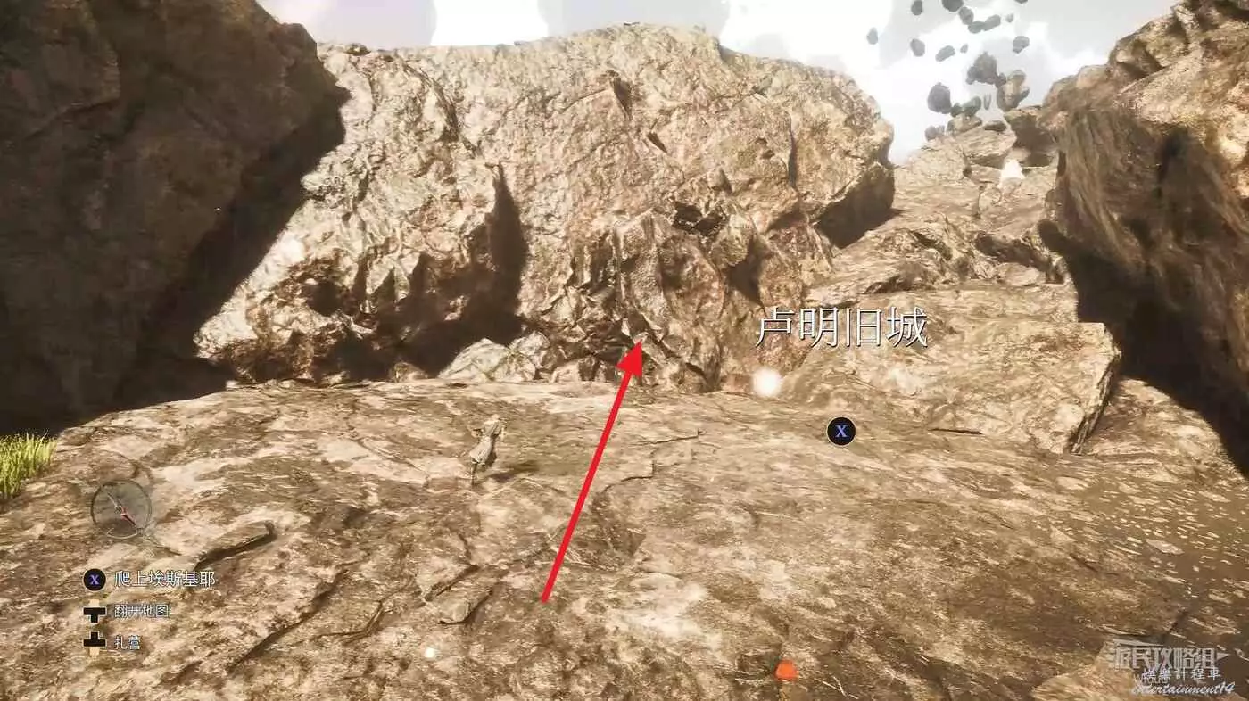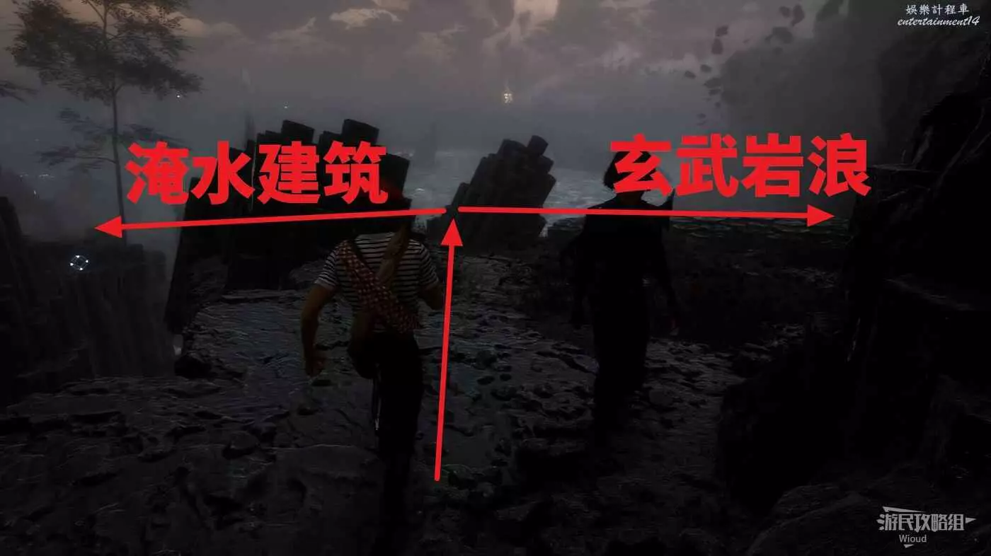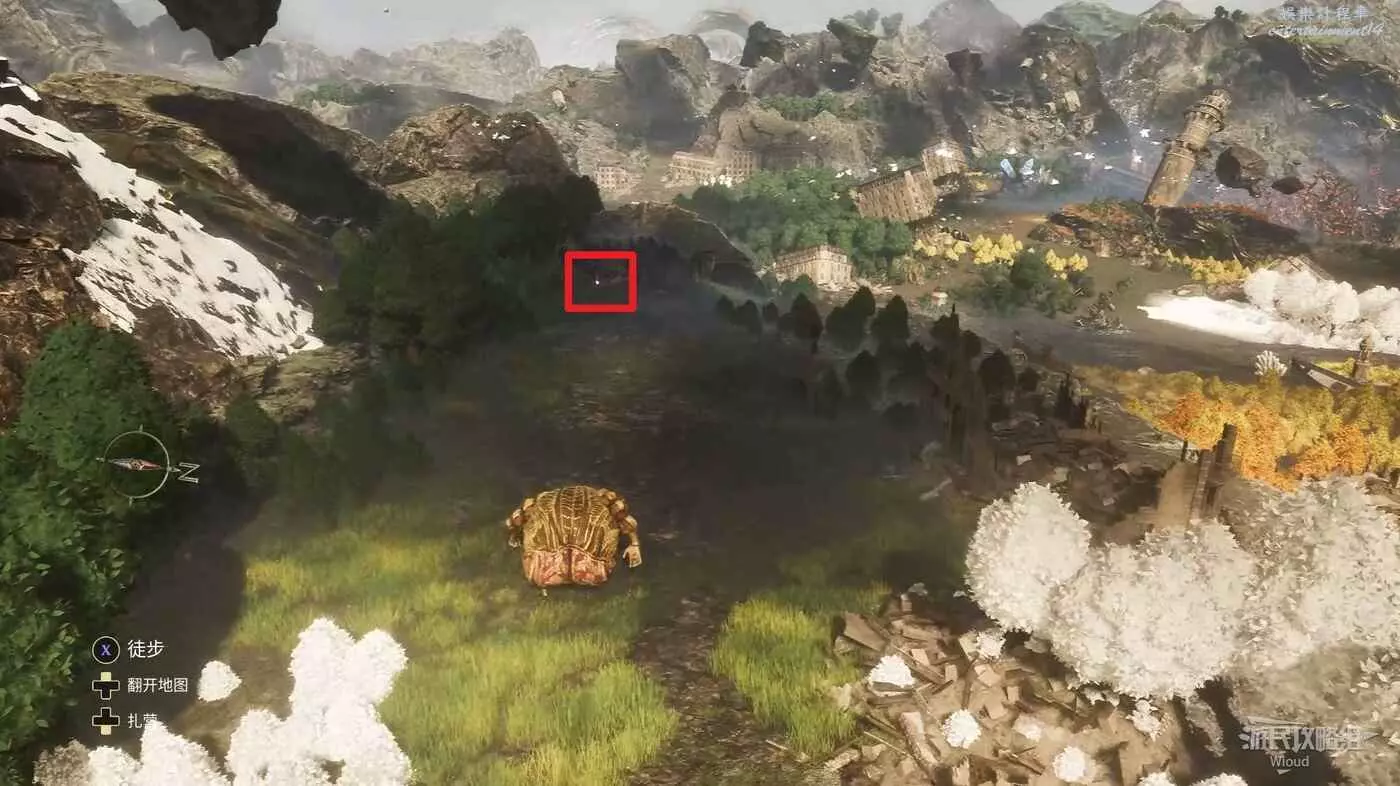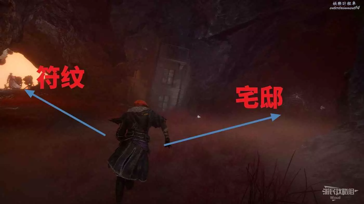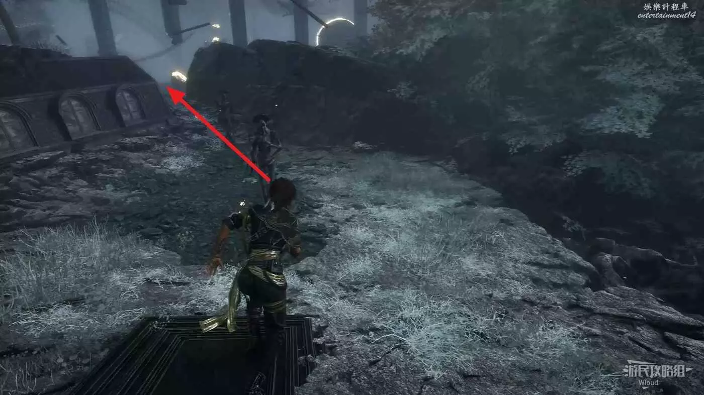 回到建築外區域,面對來時的入口,左側土坡是從失落的戰場來的入口,右側有樓梯的出口通往盧明舊城方向大地圖。