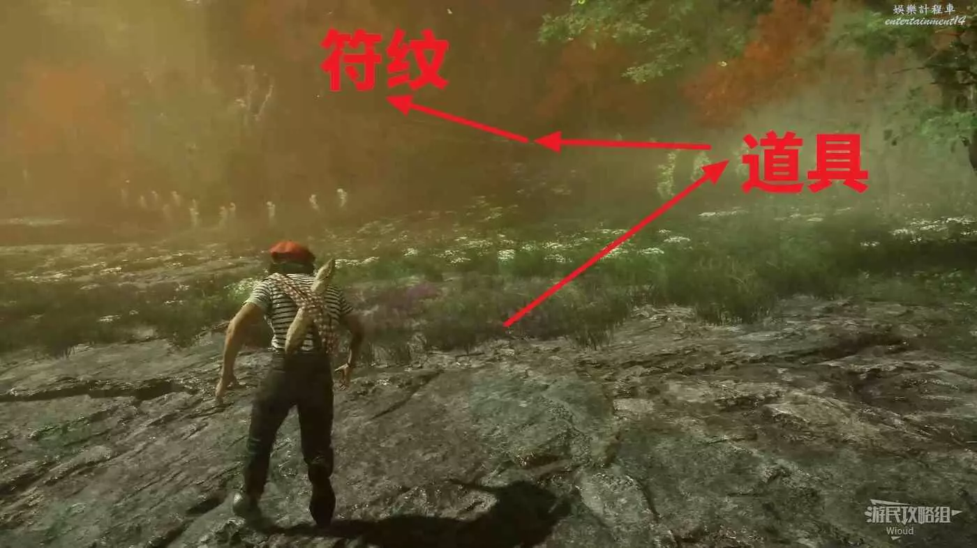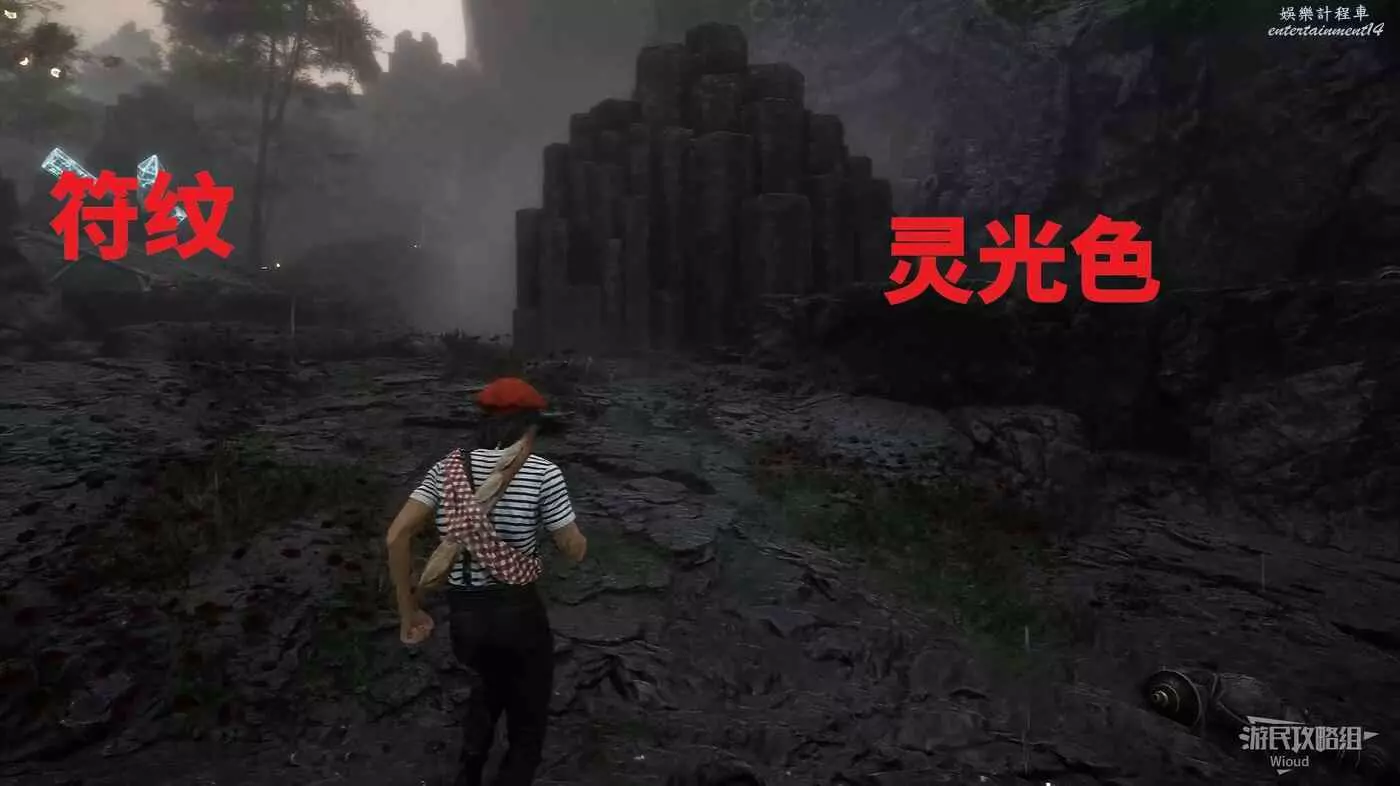 沿路走,直到右側出現一個可以爬的臺階,上去可撿一個【靈光色】,移動到左側全是怪物的位置可撿到符紋【振奮療愈亮色】。