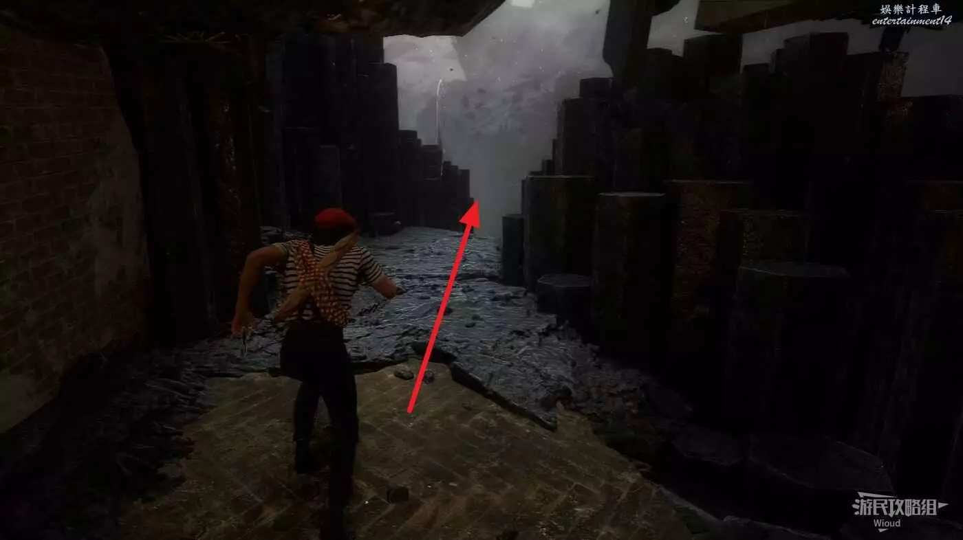 沿路走到盡頭,爬繩索進入建築,繩索口旁邊有個小門,穿過小門直走。