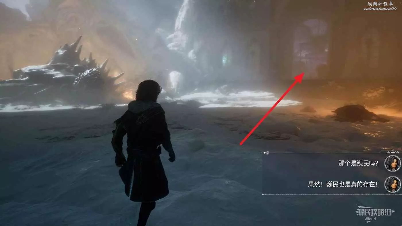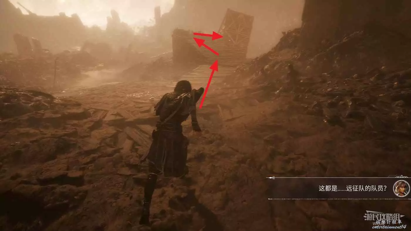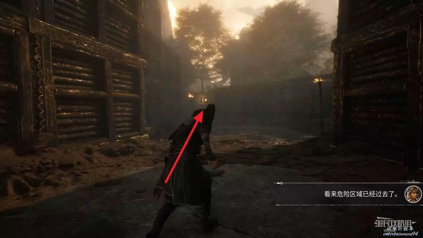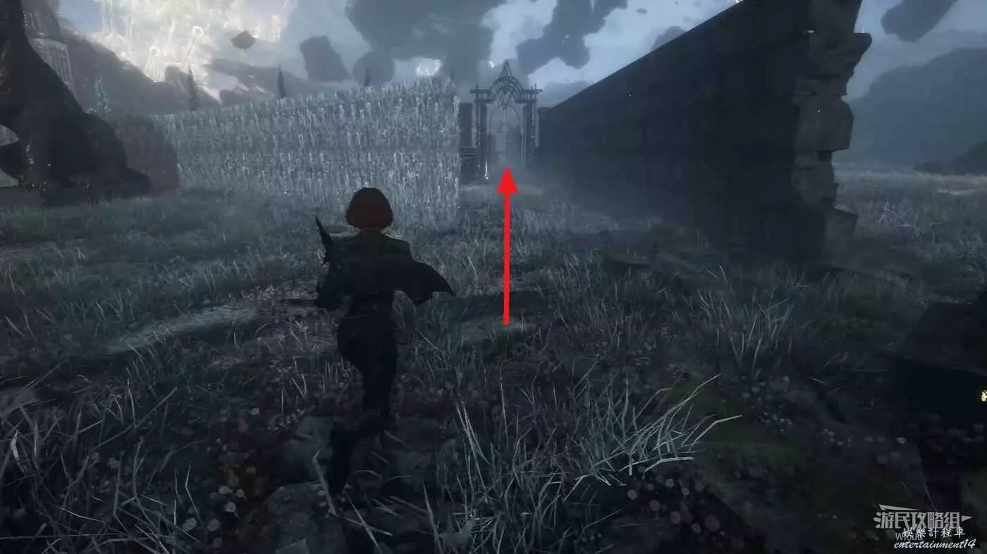 進入關卡,沿著路走到一個開闊區域,進入大型拱門觸發劇情。