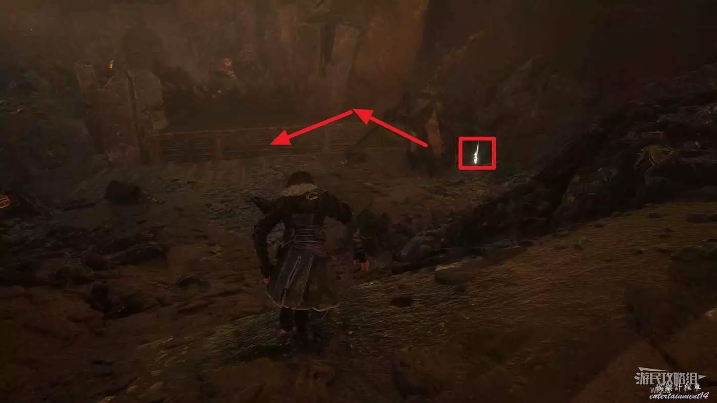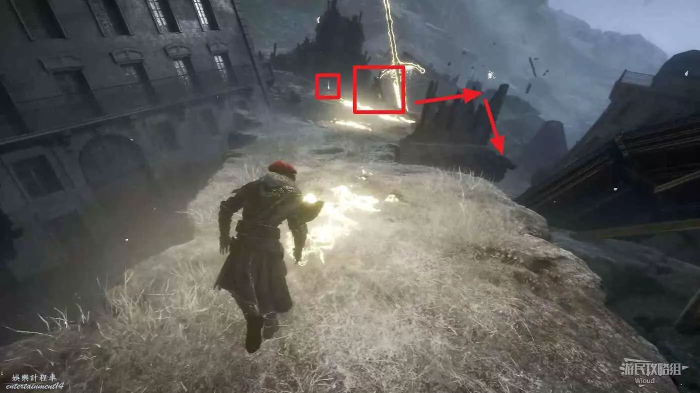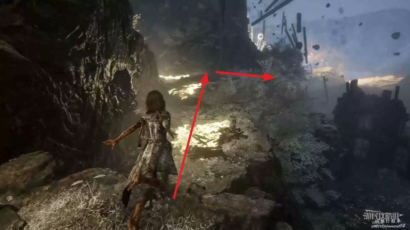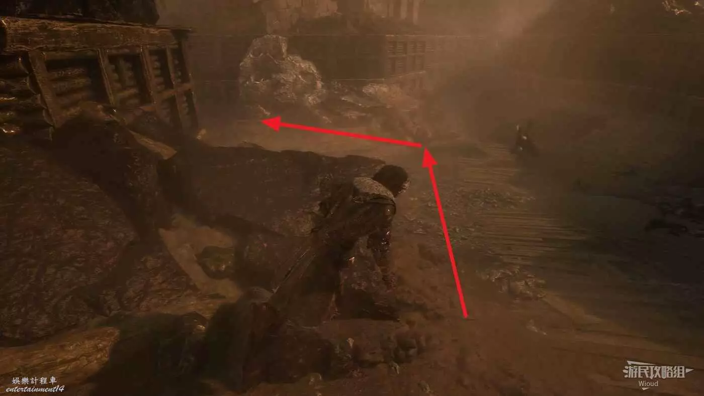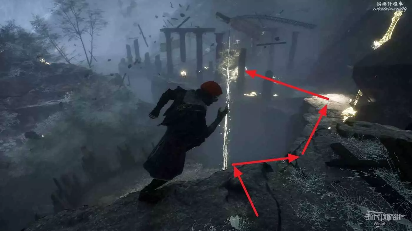 回到之前說的岔路口,通過鉤爪跳到對面平臺,沿路往左走。