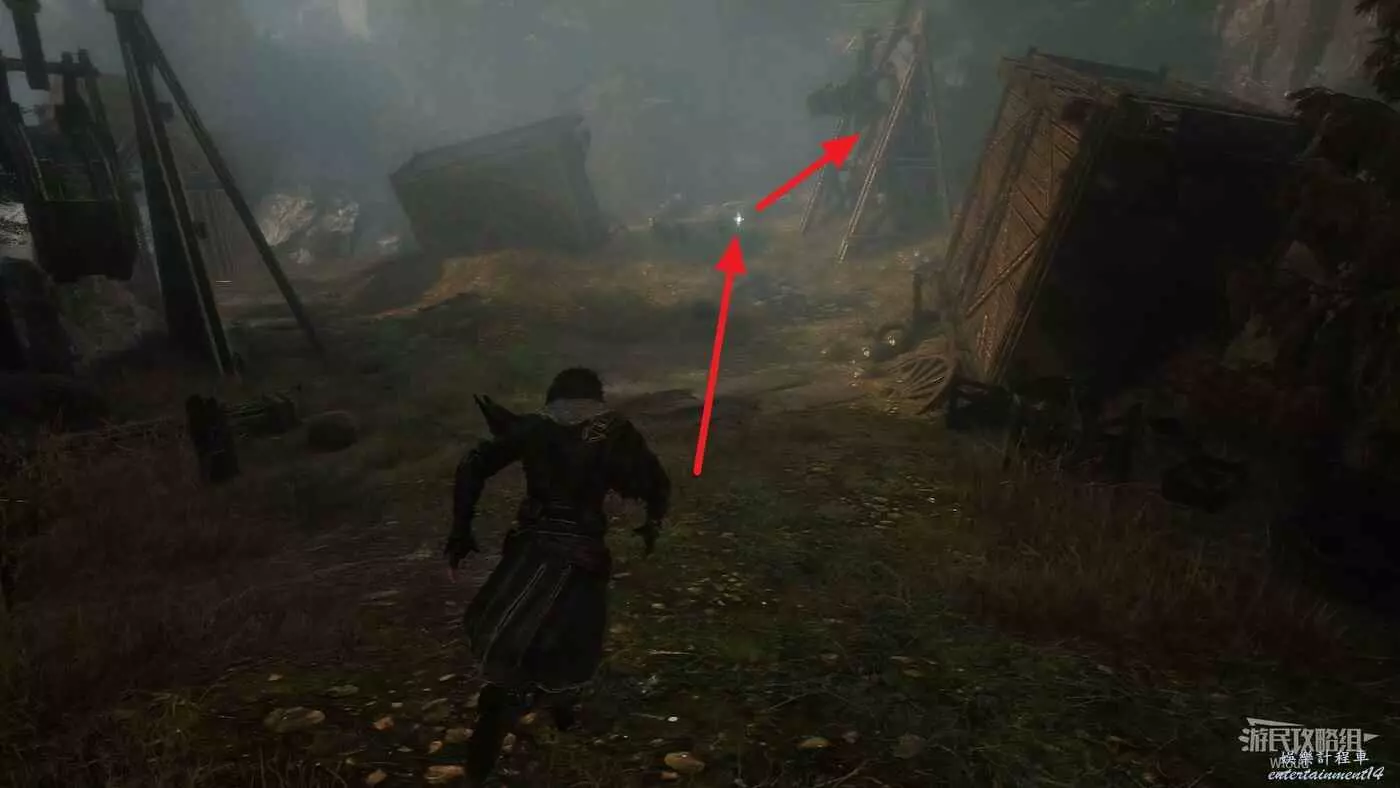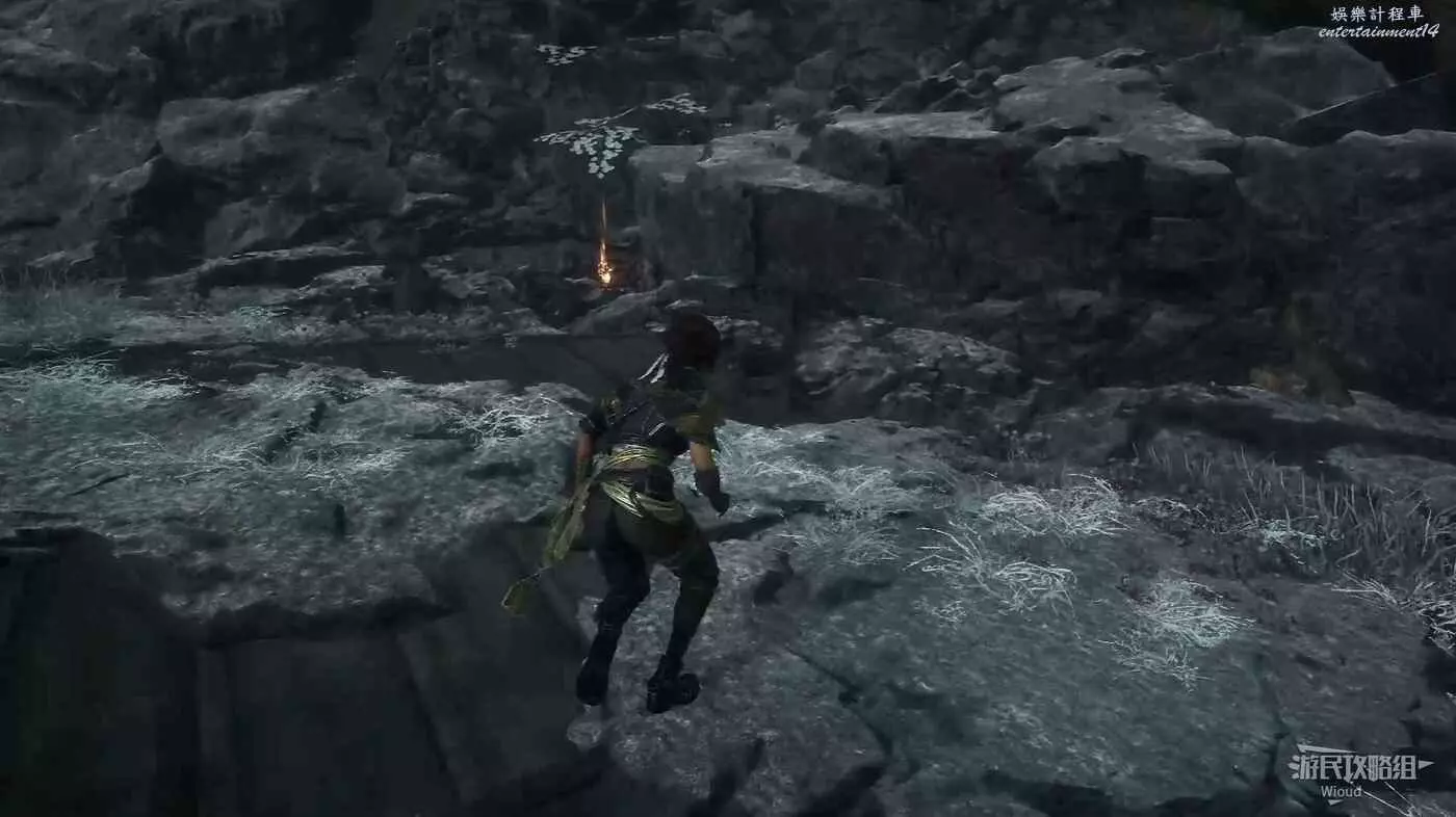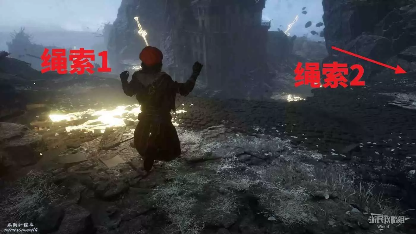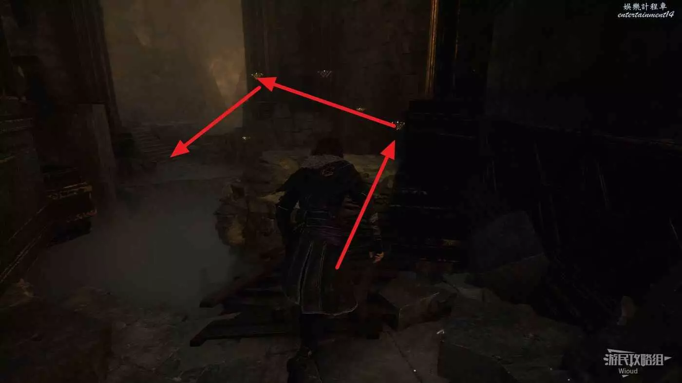 回到之前說的岔路口,通過鉤爪跳到對面平臺,沿路往左走。