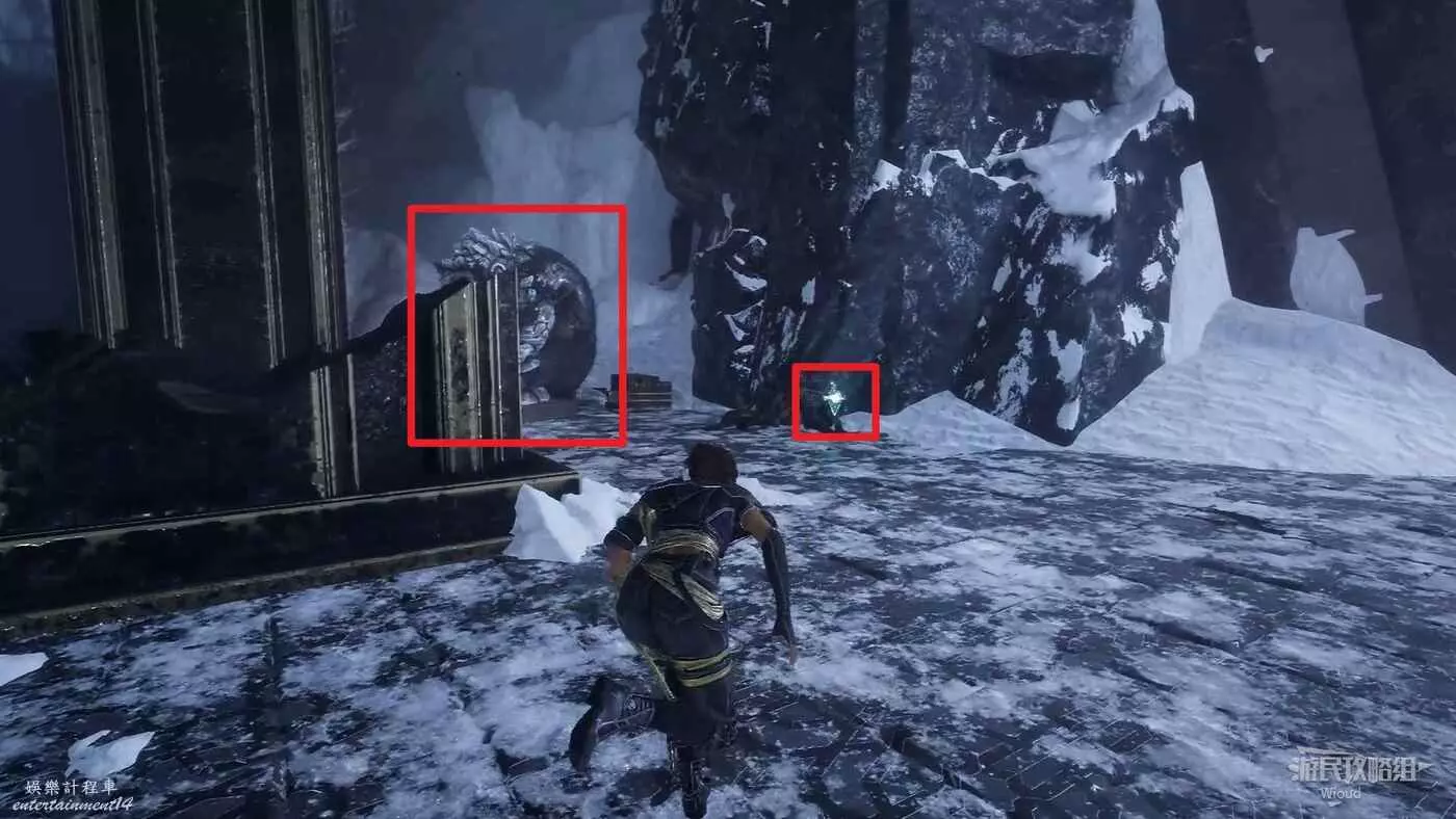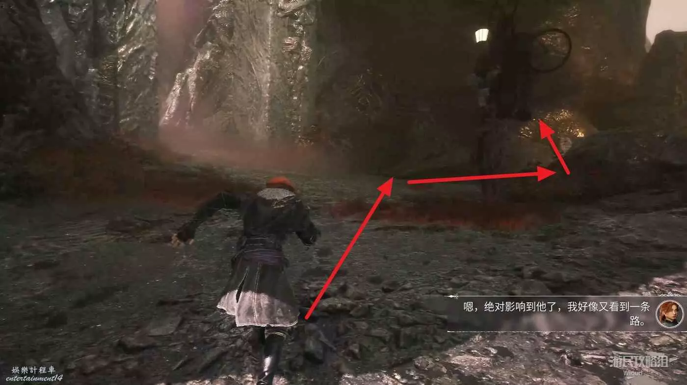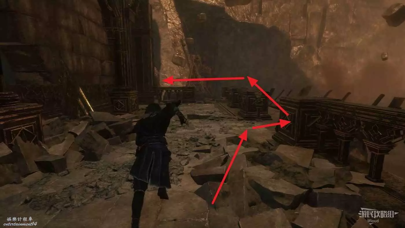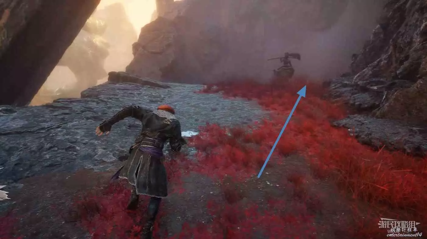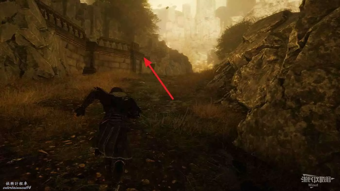 回到之前說的岔路口,通過鉤爪跳到對面平臺,沿路往左走。
