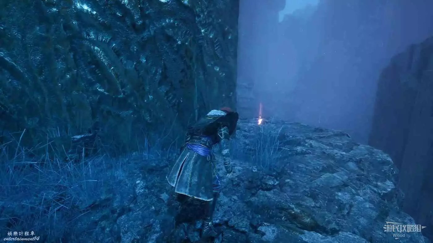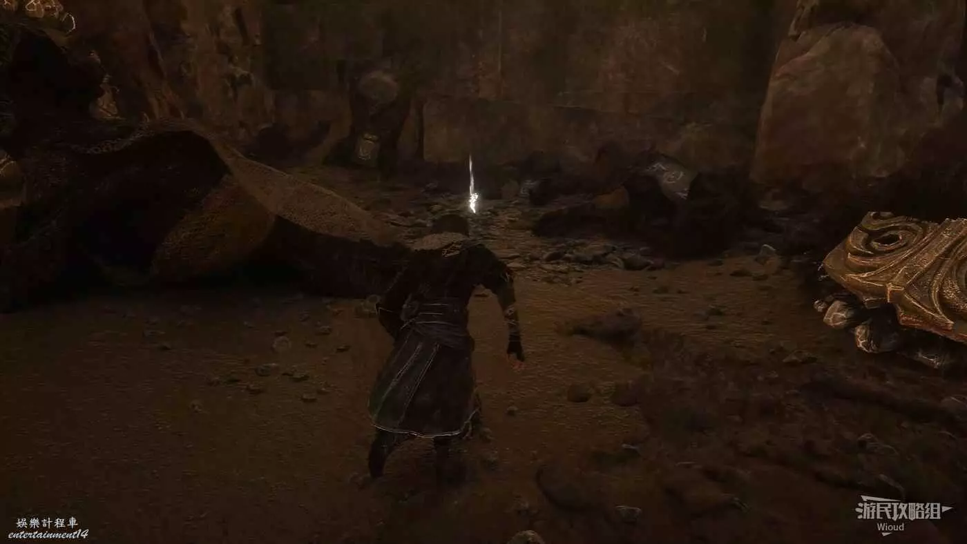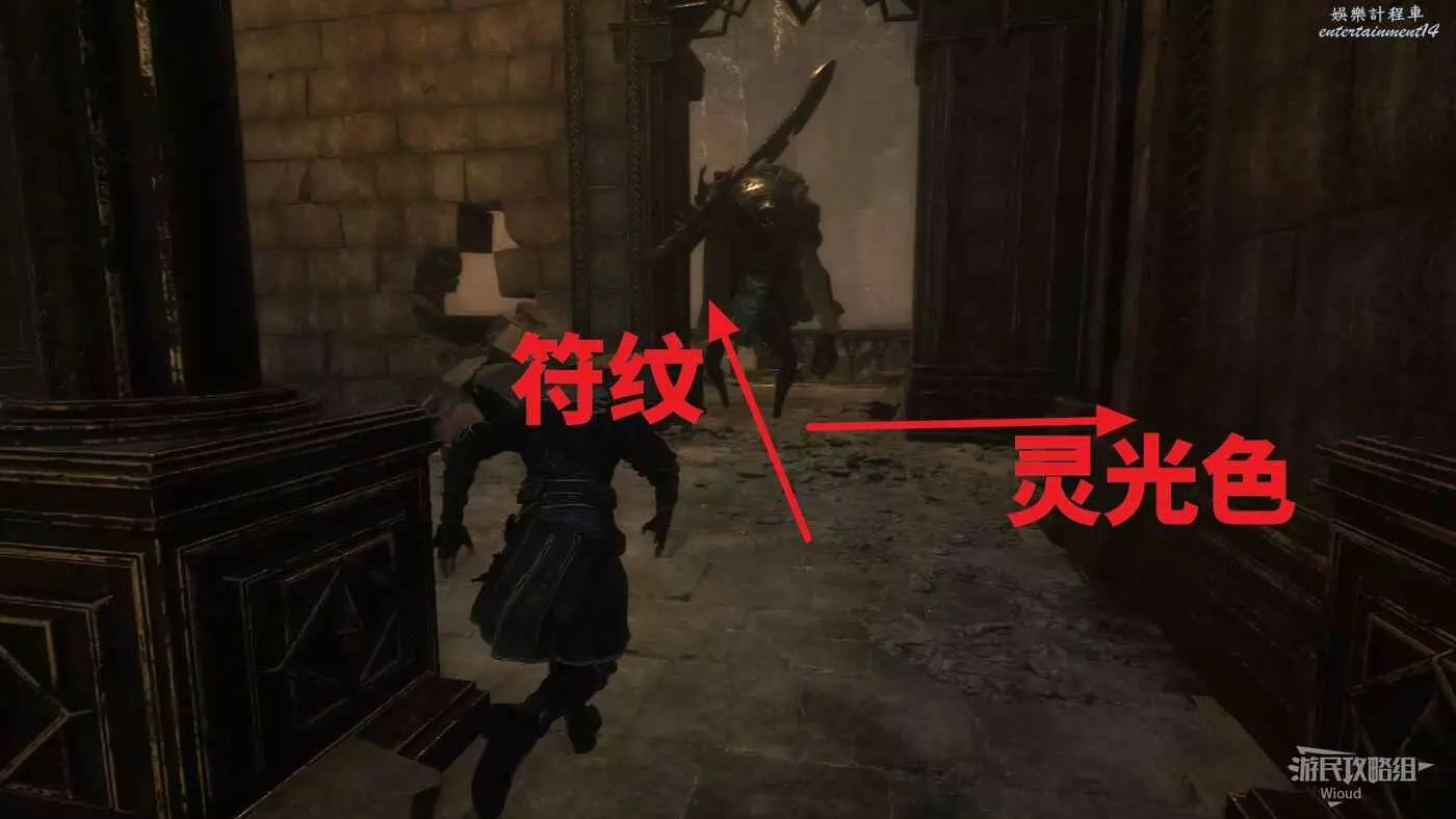 完事貼著右牆沿著上坡走,前方會有一個持盾敵人,將其擊敗後右拐可撿到符紋【無畏鬥士】。