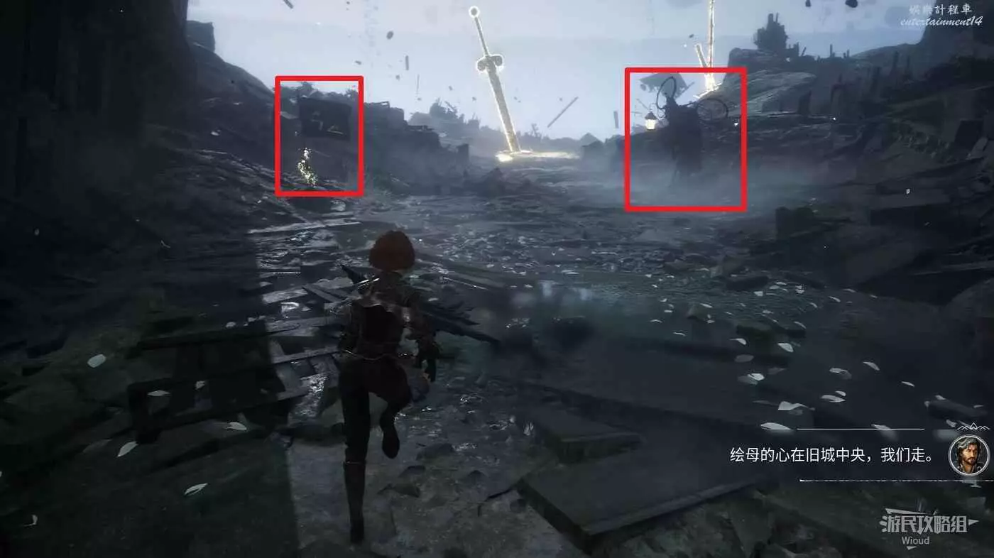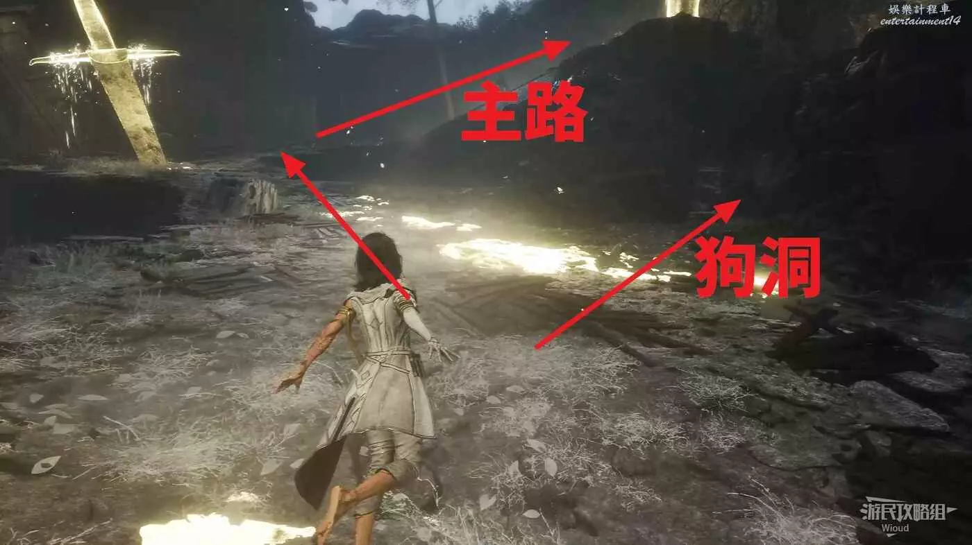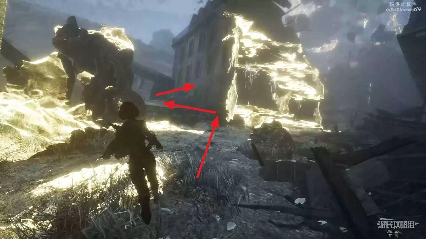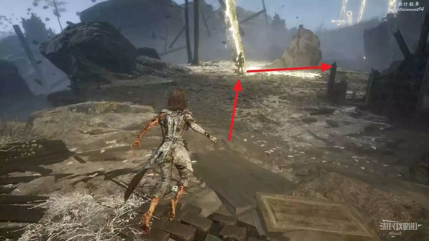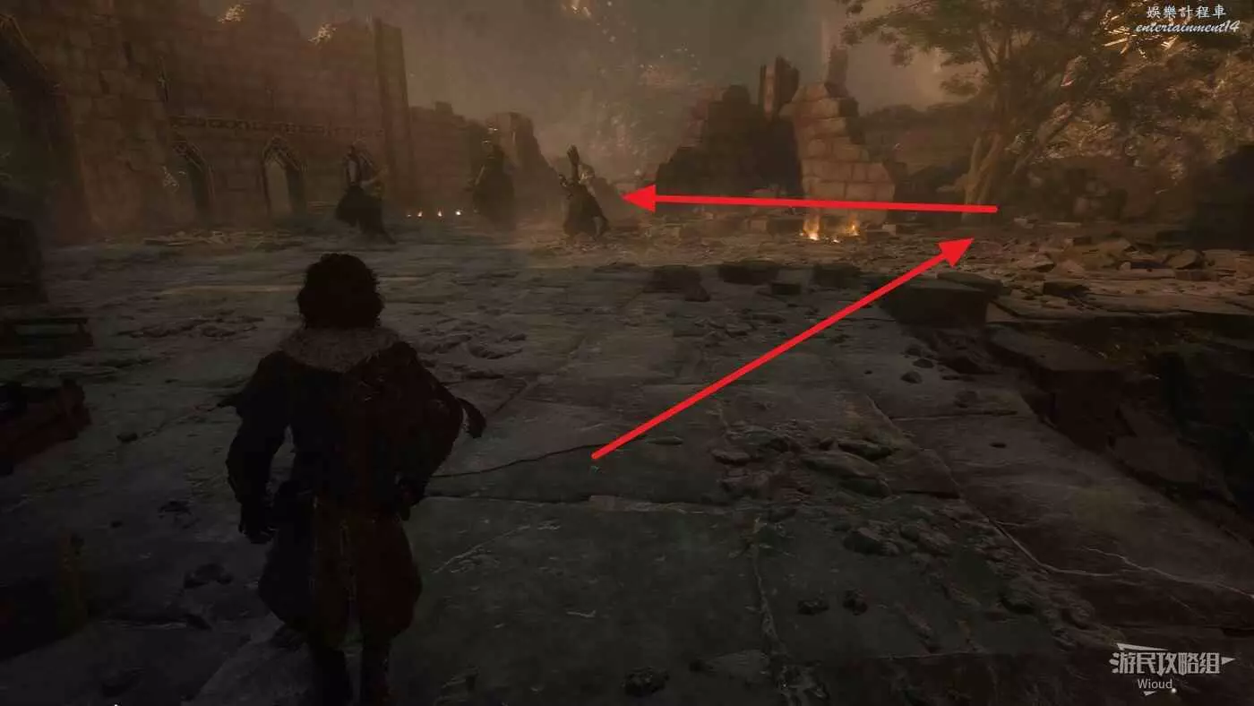 沿旗幟左側主路走,直到穿過一個斷裂的拱門遇到第一個敵人。