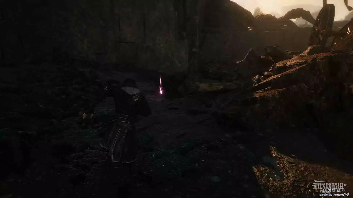堡壘廢墟旗幟往左走,沿著盡頭的梯子機關移動到另一條路,中途擊敗一個敵人穿過一個三角拱門,可以看到前面有兩個敵人,敵人位置可以撿到一個【靈光色】。