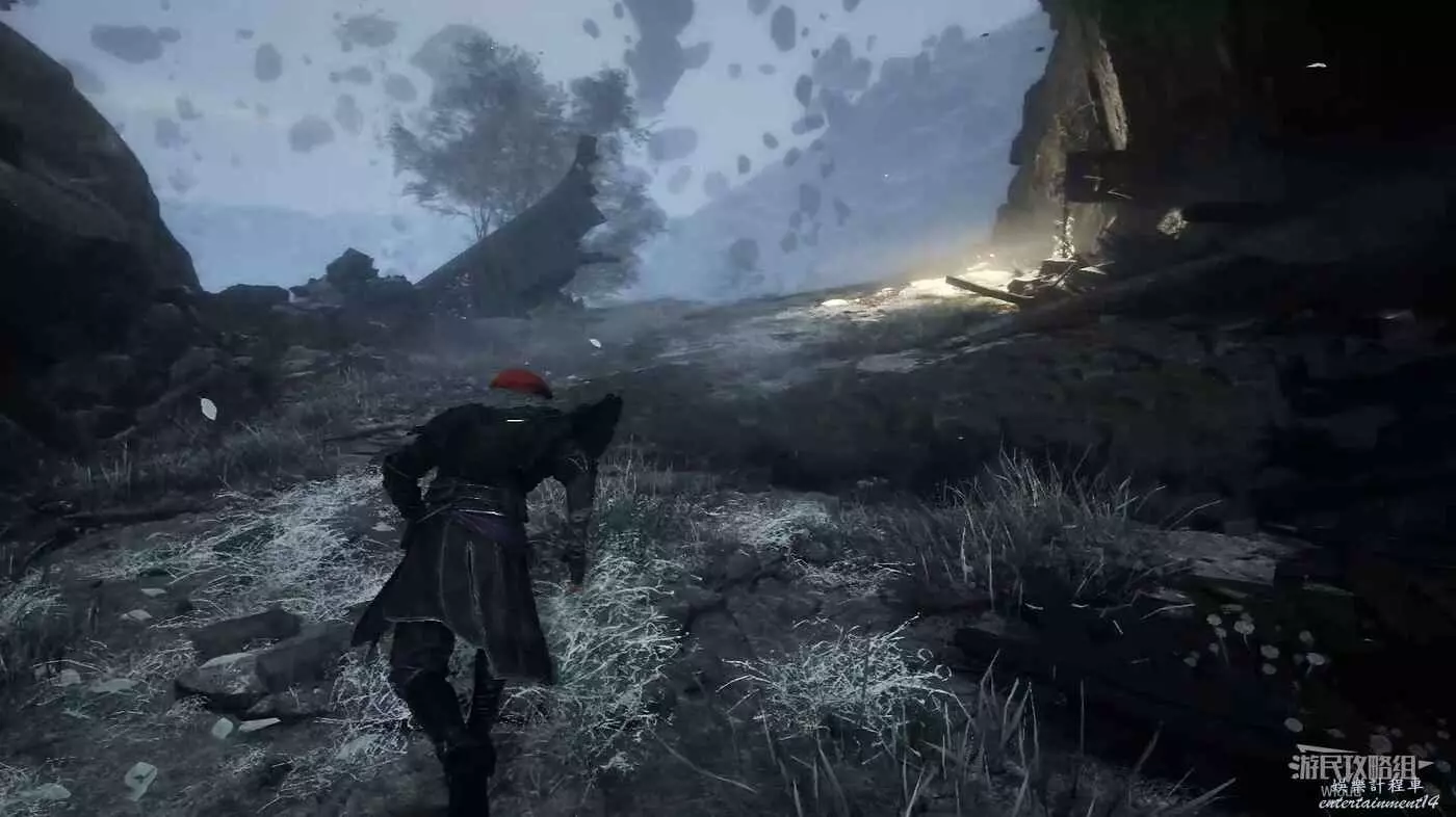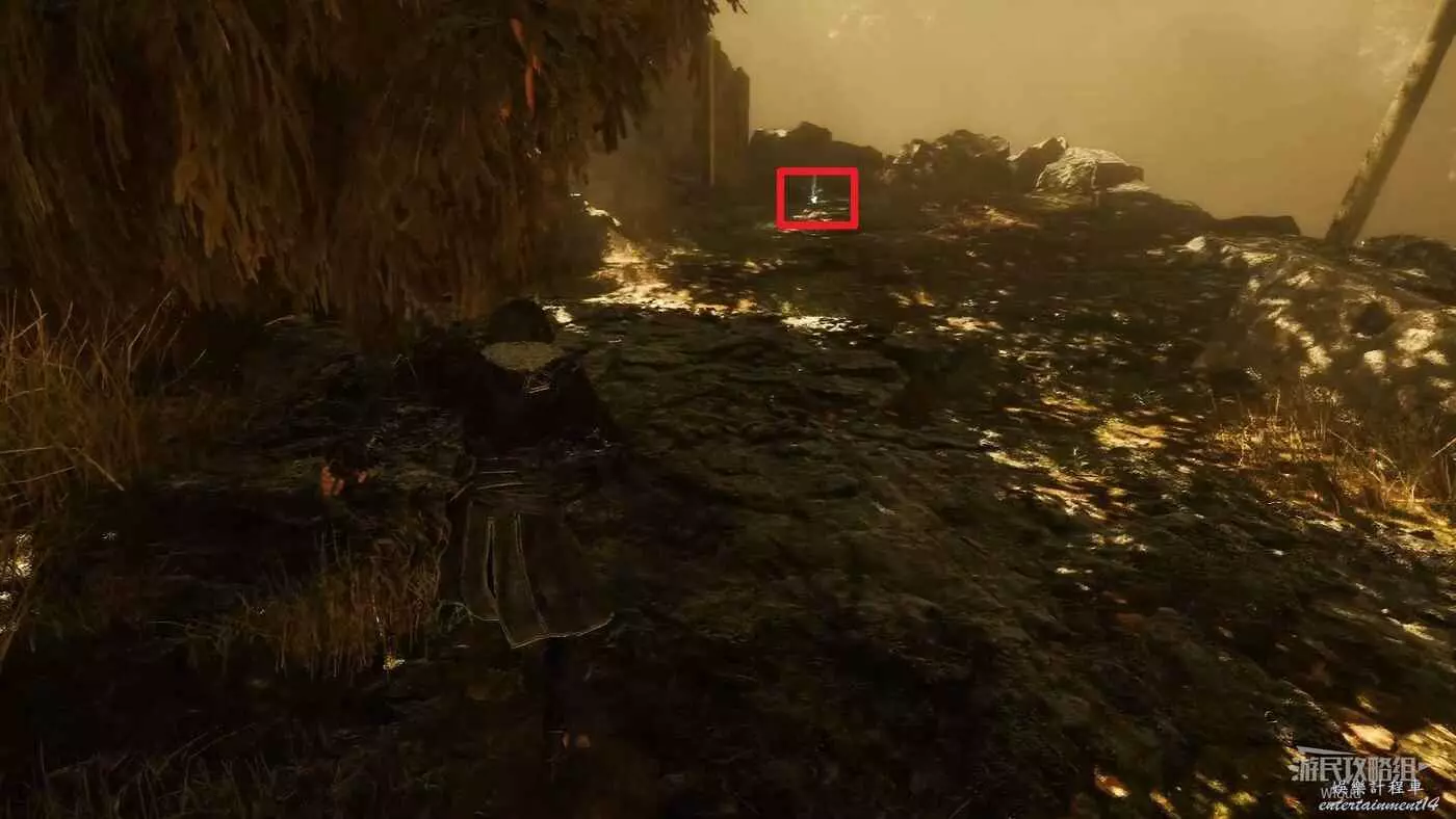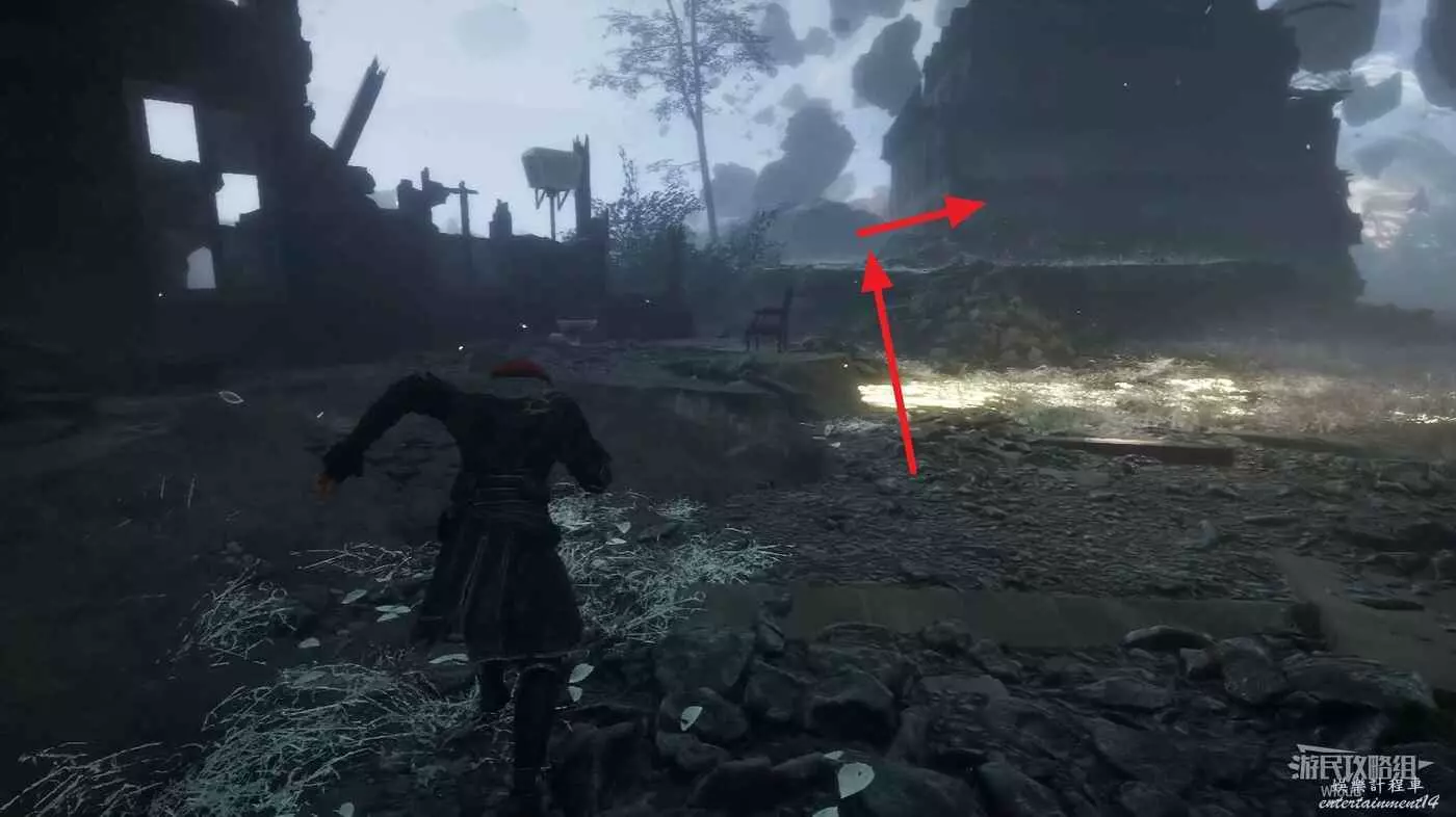 沿路走,直到左側看到一段破損的牆壁,通過缺口爬上去往裡走,可撿到一個【靈光色】。