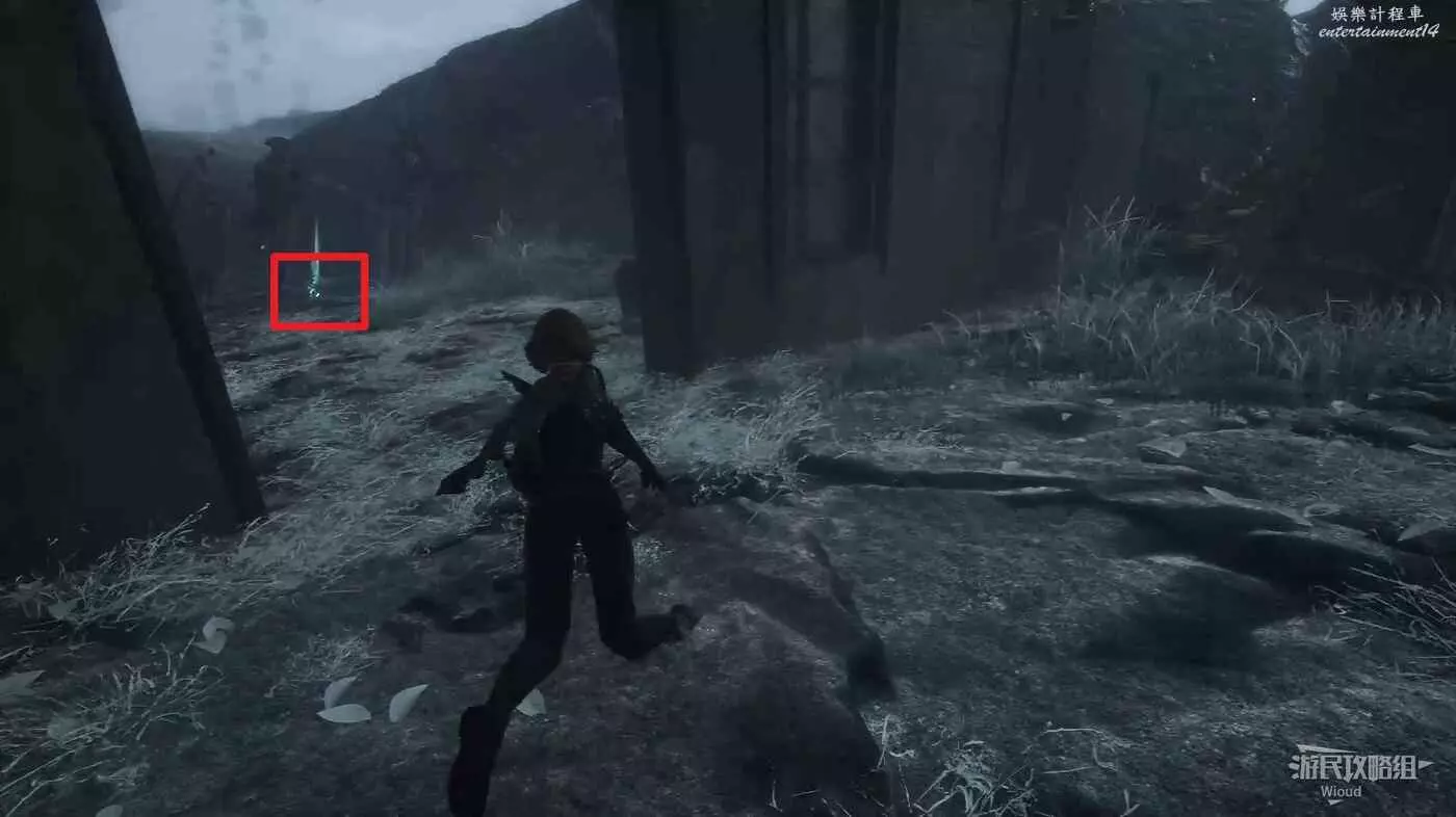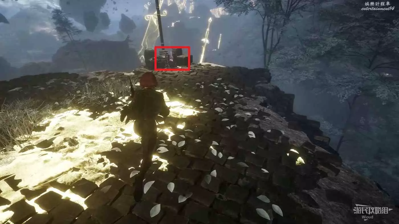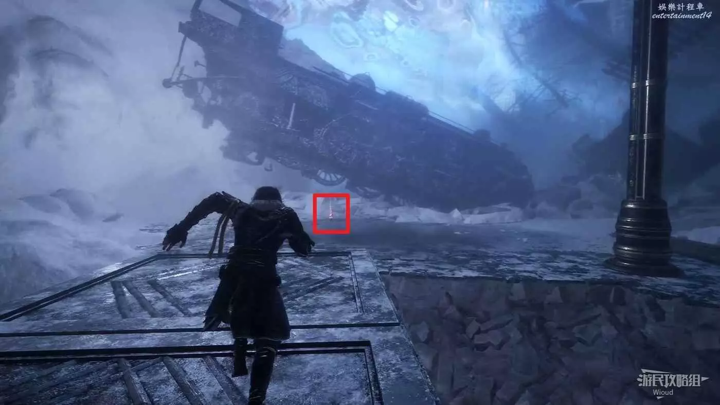 將兩個敵人擊敗後,維爾索突然不知所蹤,視角回到瑪埃爾立刻轉頭走到頭往左後方繞,通過鉤爪跳到上方平臺拿一個【靈光色】。