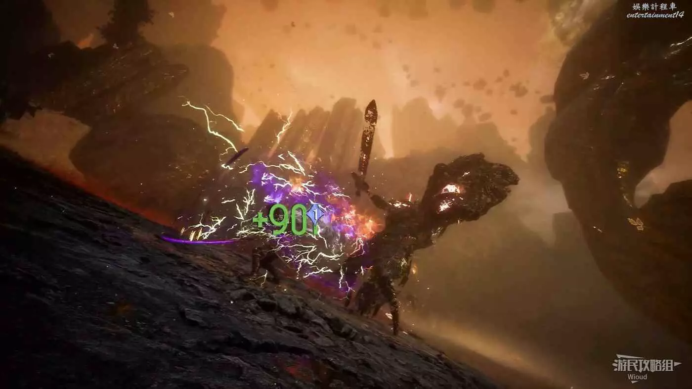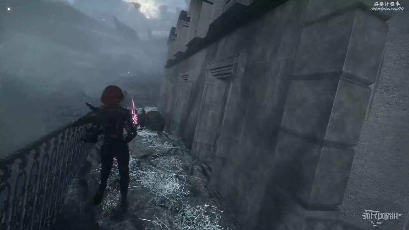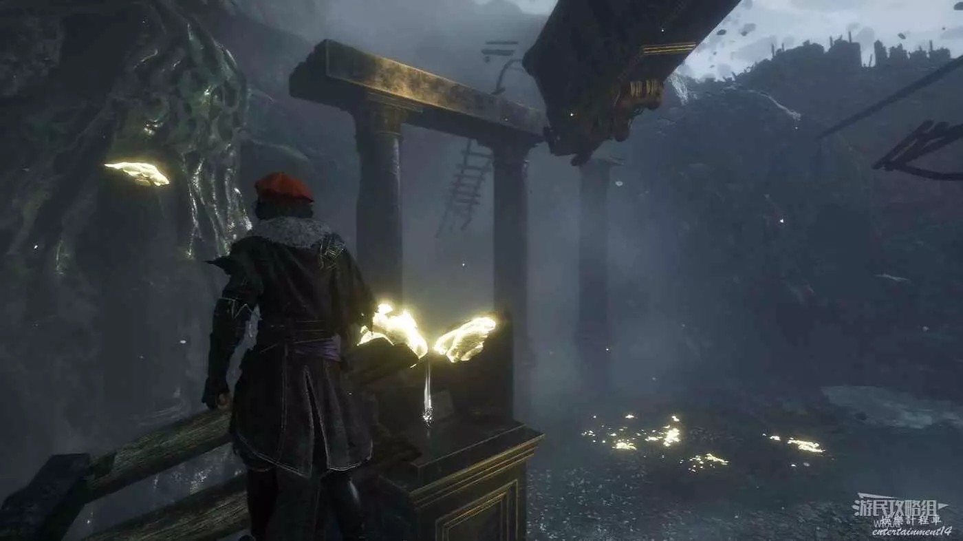 將兩個敵人擊敗後,維爾索突然不知所蹤,視角回到瑪埃爾立刻轉頭走到頭往左後方繞,通過鉤爪跳到上方平臺拿一個【靈光色】。