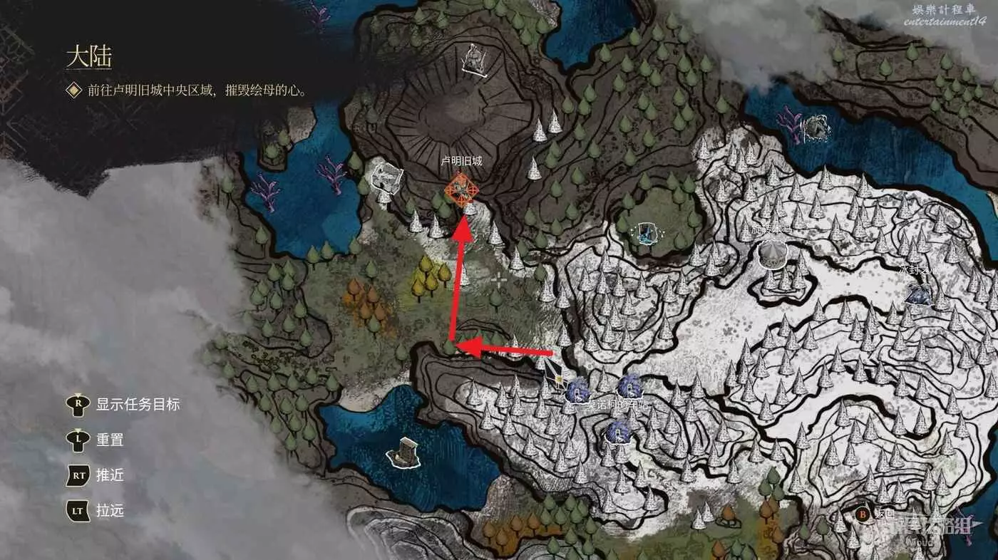 大地圖貼著左牆走,盡頭可撿到一個【靈光色】,然後直接進入地圖標注的地圖【盧明舊城】,大地圖日後探索!