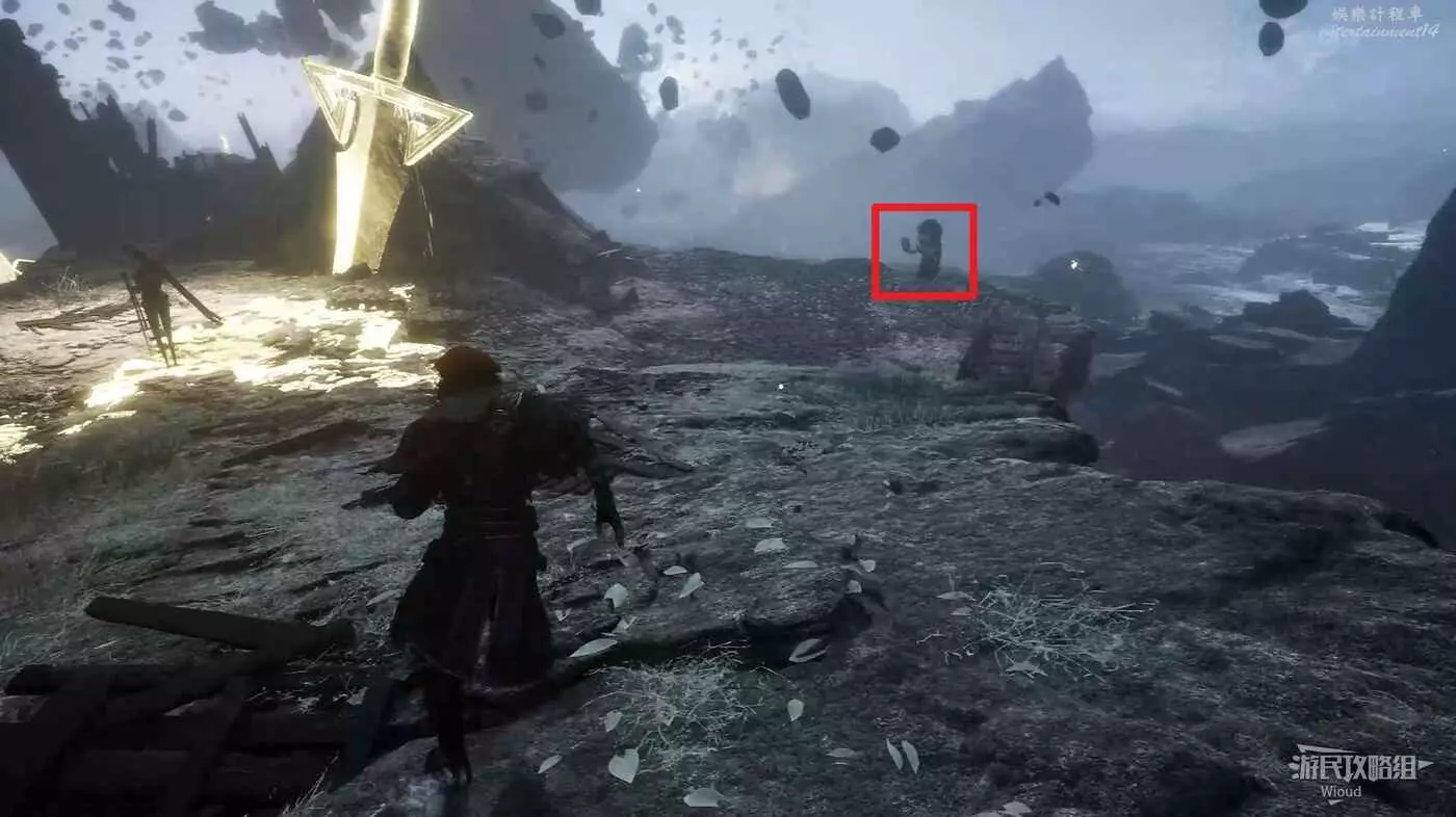 轉頭往回走,此時左側有個上坡,爬上去擊敗倆敵人,拾取中間道具點可獲得【複生亮聲碎片】。