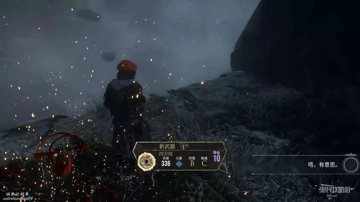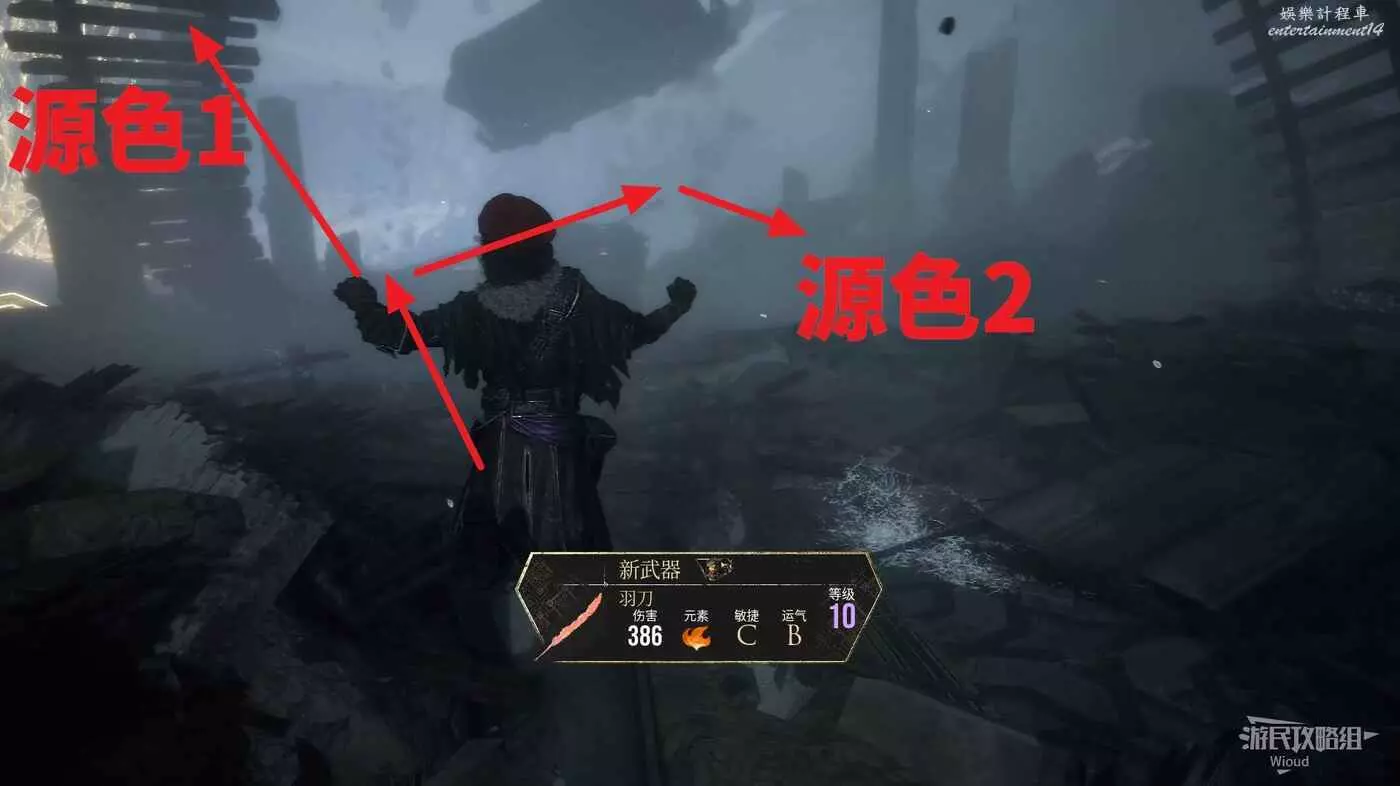 回到中間過道走到盡頭往右拐,右側可撿到一些源色,擊敗著火的精英怪可獲得符紋【振奮格擋】與武器【疾刃鐮】。