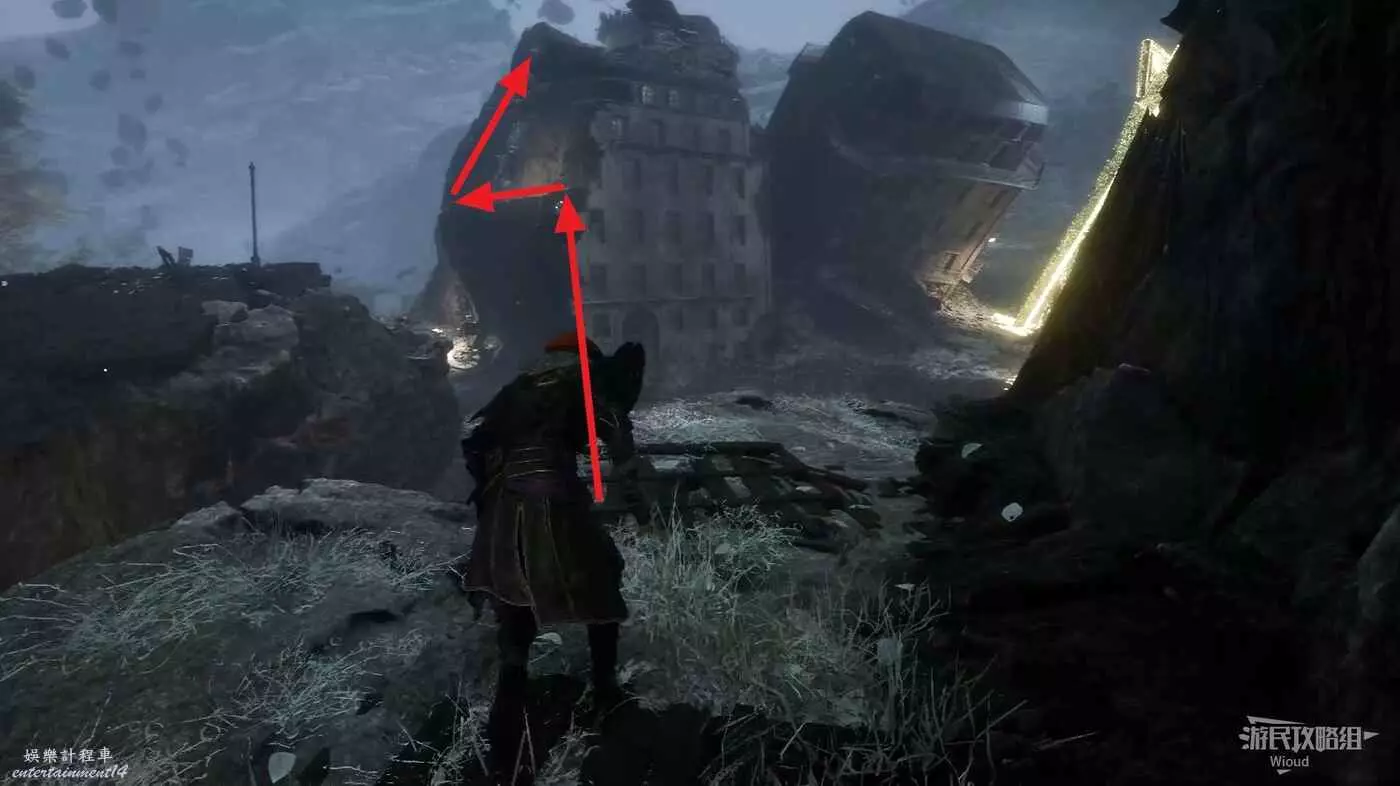繪籠位置回頭看向第一個能量塊的建築,沿著下圖箭頭所示路線,爬到建築左側繞到右側可以拿到一個【靈光色】。