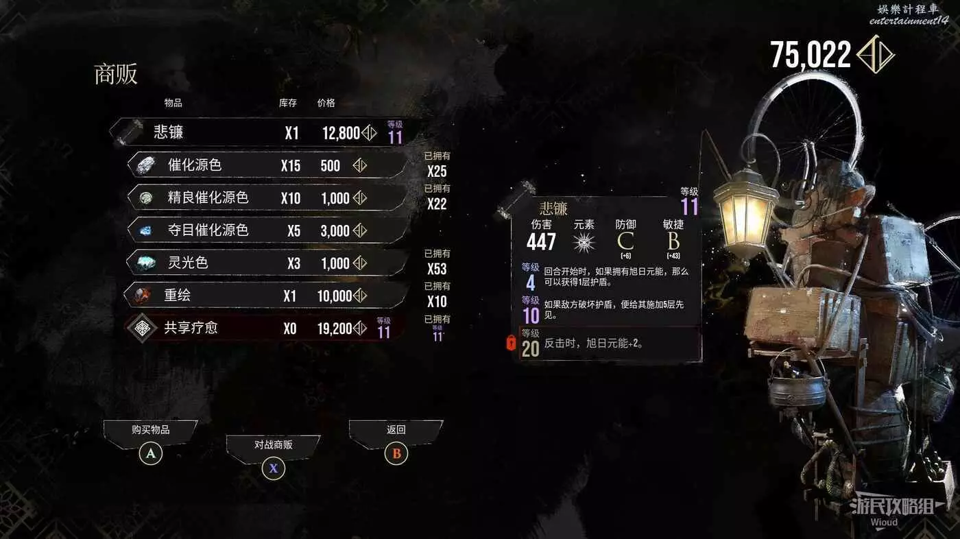 旗幟前方有個刷頭精商人,此處可購買符紋【共用療愈】與武器【悲鐮】。