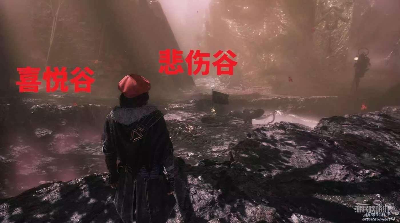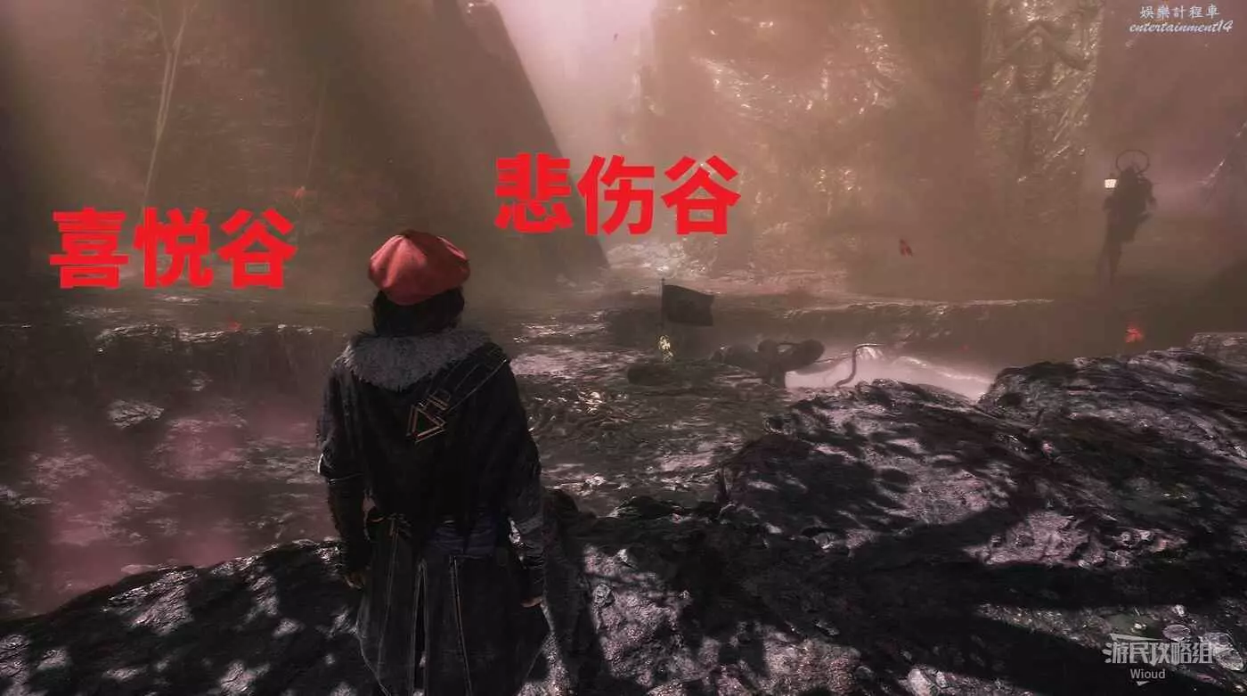 回到旗幟位置面對前方,左側第一個入口通往喜悅谷,喜悅穀右側入口通往悲傷穀,中間則是通往車由泰坦的位置,中間入口右側則是通往憤怒穀。