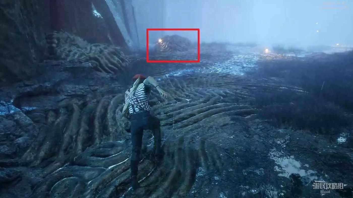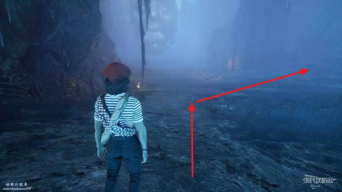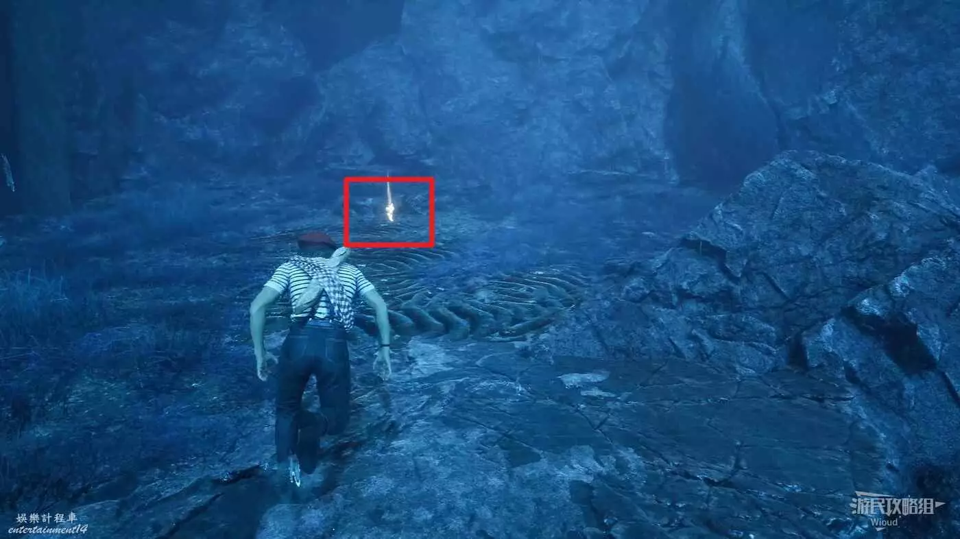 原路返回旗幟位置,貼著右牆走中間的主路,直到右側出現一大塊開闊區域,進入右側散發藍光的洞穴內。