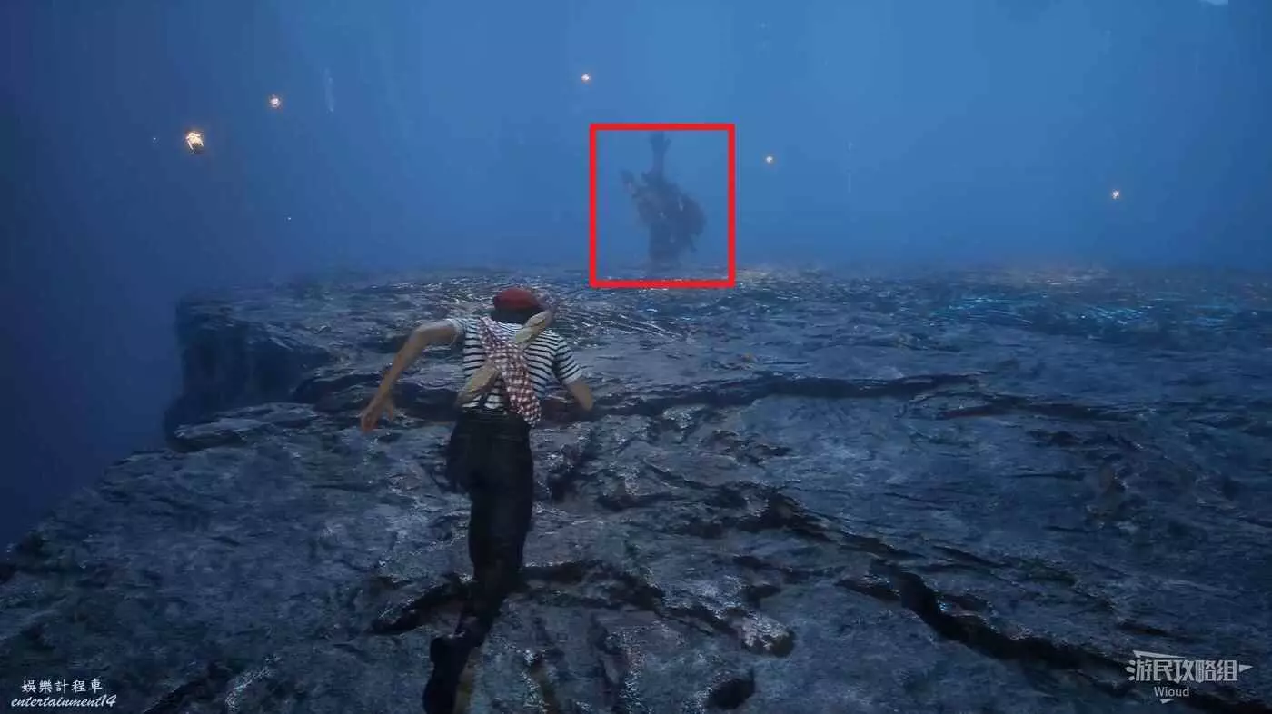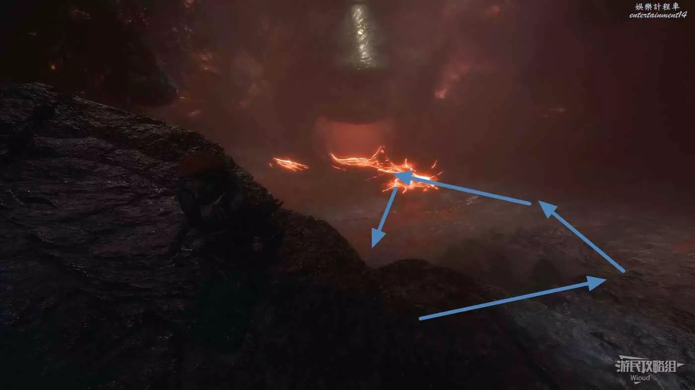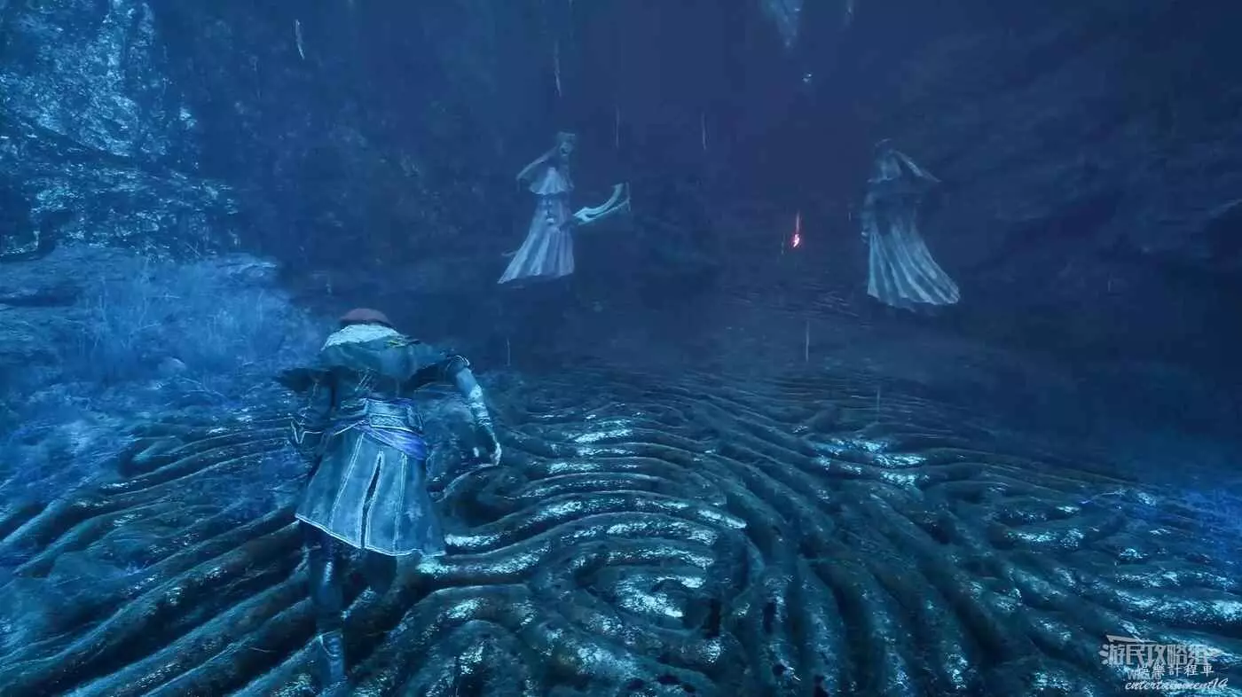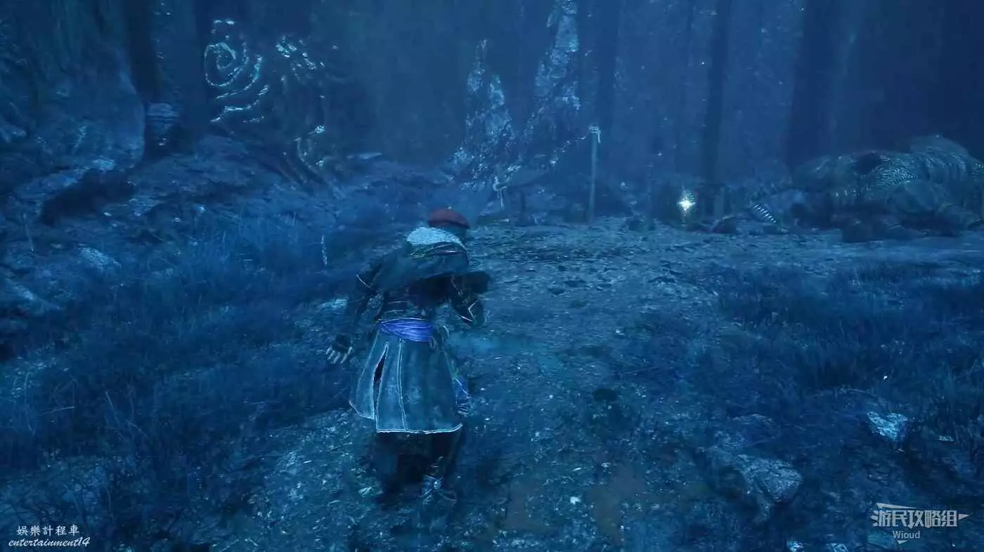 原路返回旗幟位置,貼著右牆走中間的主路,直到右側出現一大塊開闊區域,進入右側散發藍光的洞穴內。