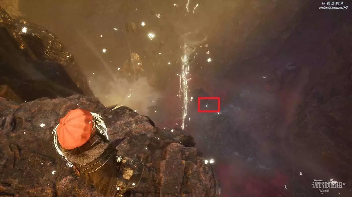 從繩索1移動到底部,沿著下圖路線往右側斷壁繞一圈,可撿到一個【靈光色】。