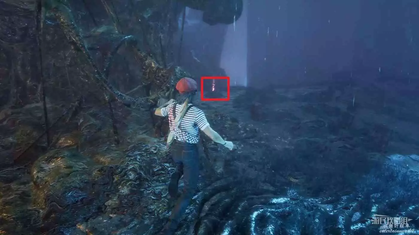 回到旗幟位置,貼著左牆走,不遠處懸崖邊可撿到道具【奪目催化源色】。