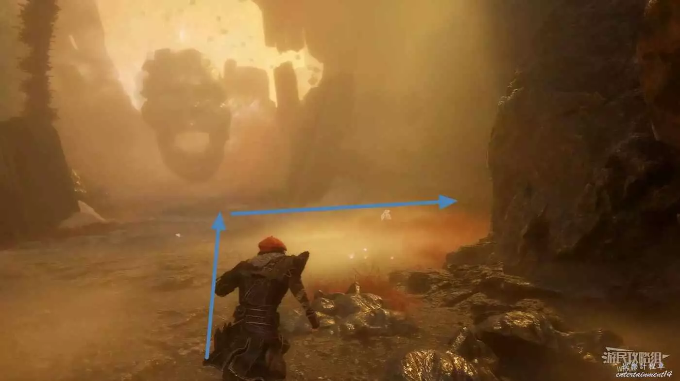 千面憤怒谷旗幟位置,貼著右牆走中間的主路,直到右側出現一大塊開闊區域,進入右側散發藍光的洞穴內。