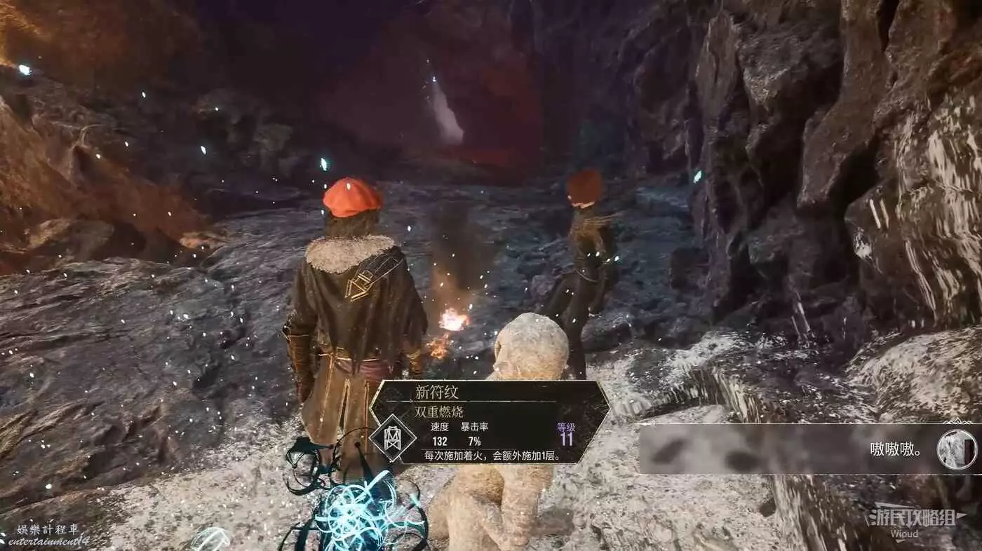 洞口先往左走,擊敗盡頭的敵人拾取藍色道具點可獲得符紋【雙重燃燒】。