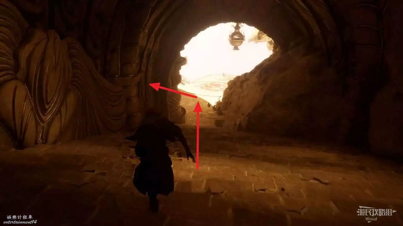 底部先穿過右側的拱門,右側有個敵人,左側道具點可拿到一些強化道具。