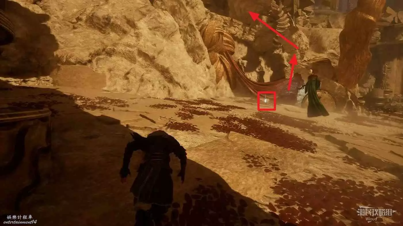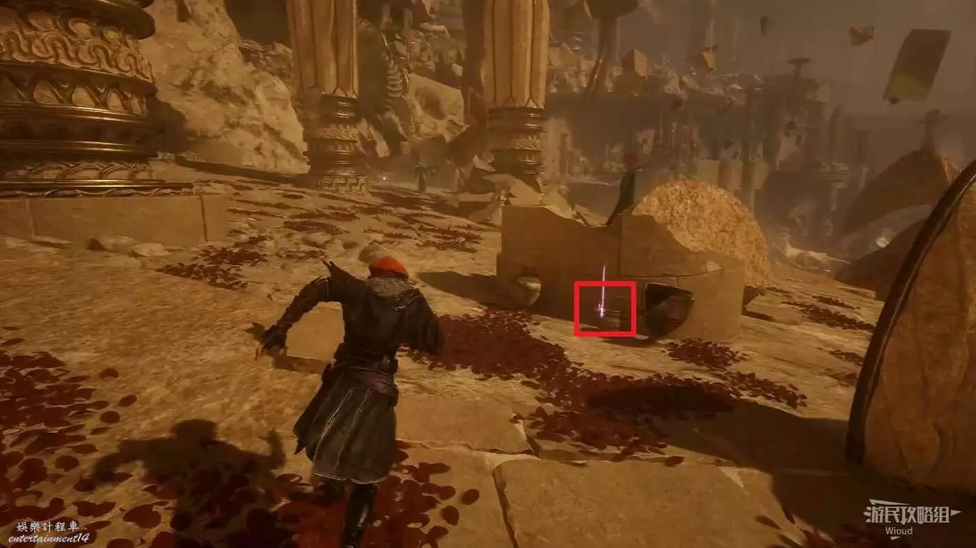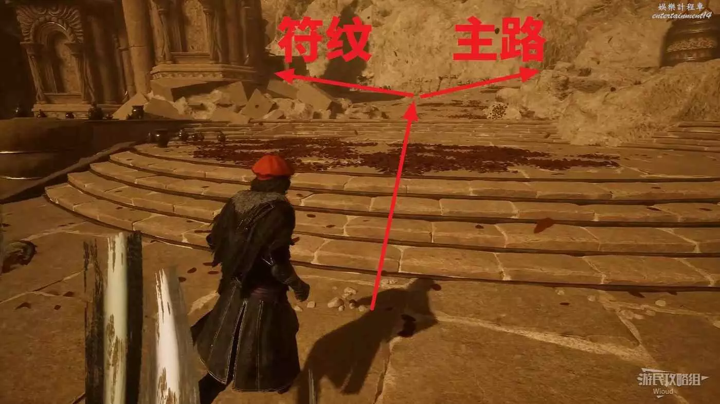 繼續往前走,穿過一小段向下的樓梯來到一個全是怪物的方形區域,此處右側可拿到【55號遠征隊日誌】,然後走左側到達一個岔路口,用破障破壞岔路右側的繪柱可拿到一些強化道具,最後通過岔路左側繩索往下走。