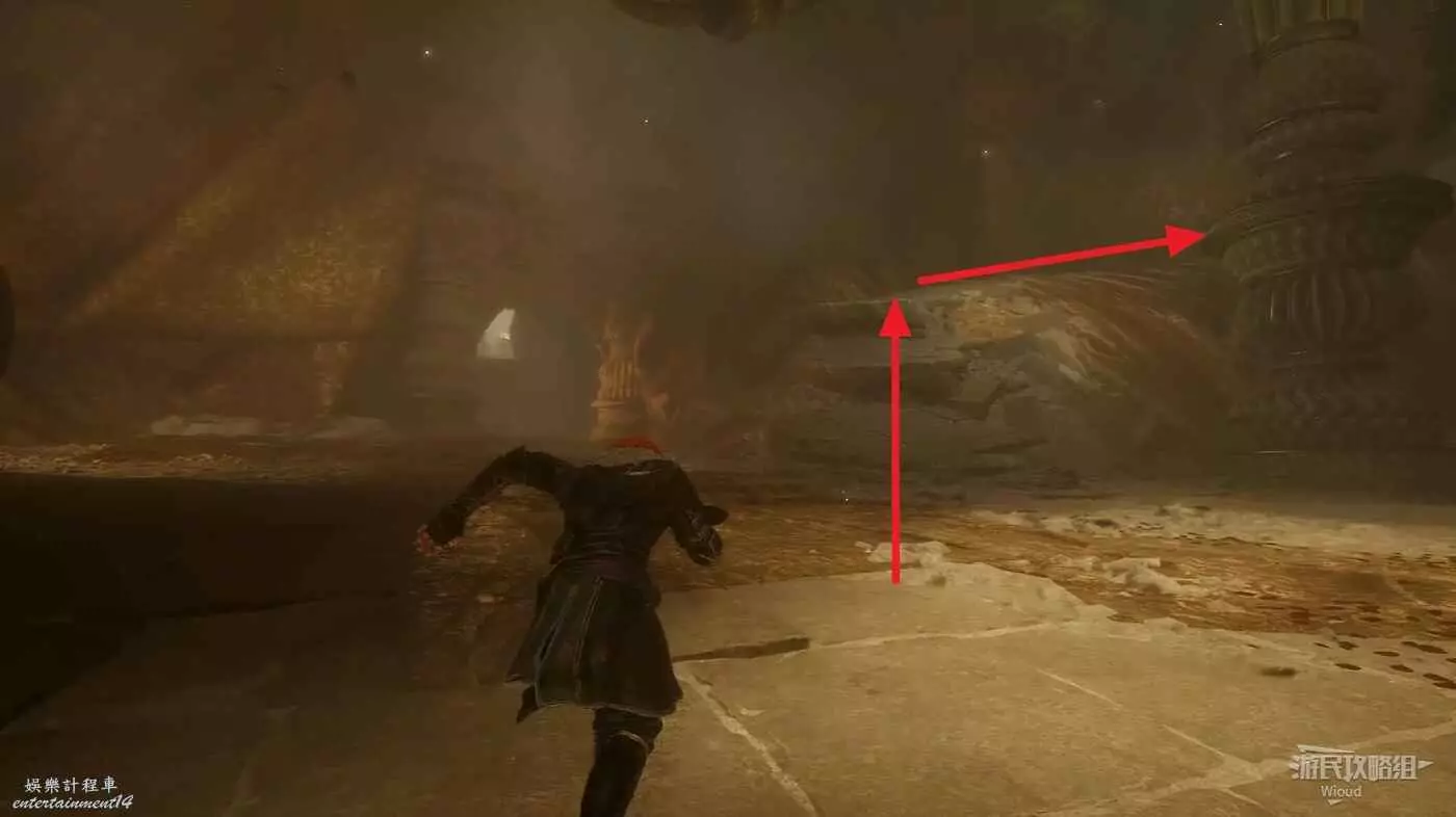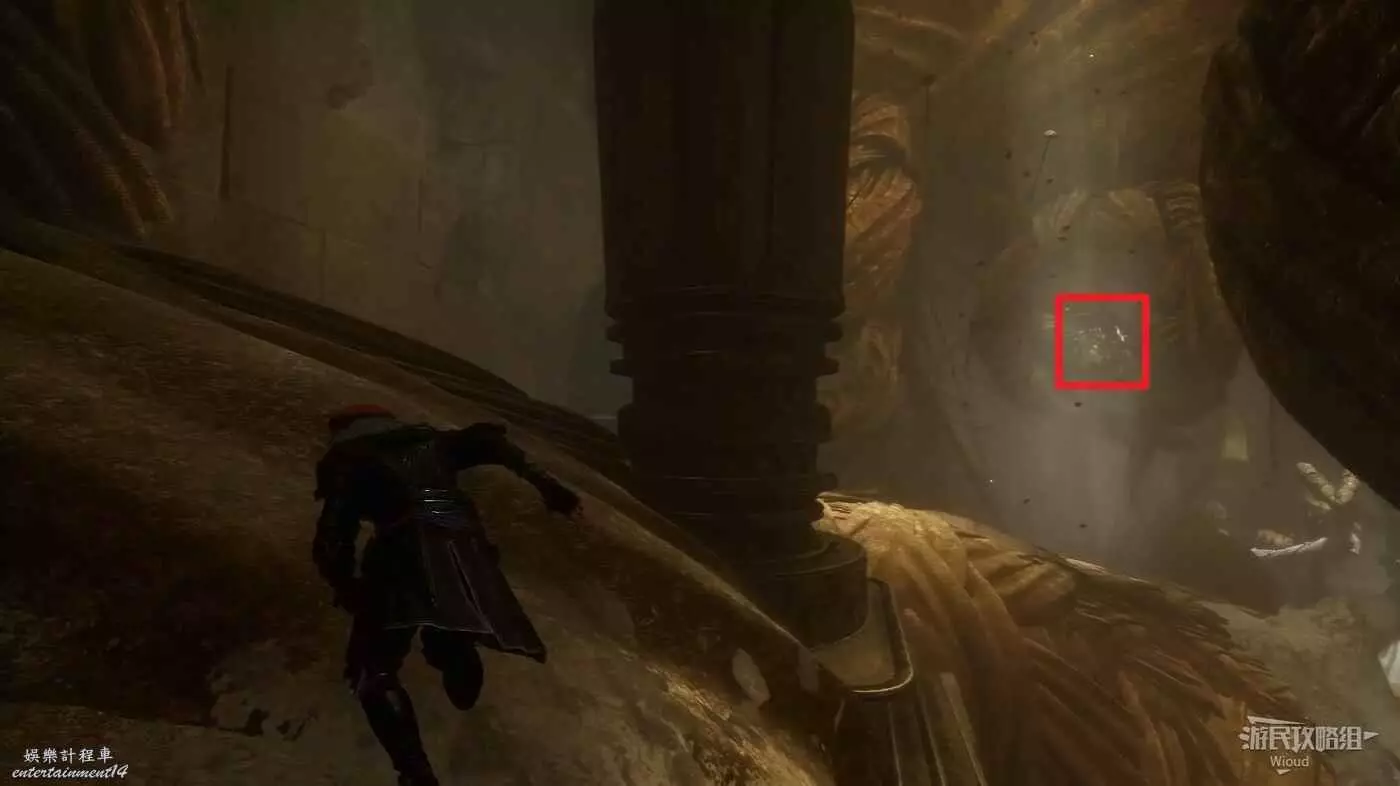 沿路繼續往前走,注意左側有個小道,上面可以撿一個強化材料,跳到底部與巨大經怪互動與其戰鬥。