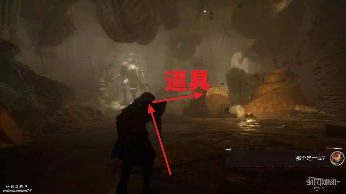 下一個房間可以看到一個巨大的經怪,先直走穿過右側的布料後右拐,盡頭可撿到一些強化道具。