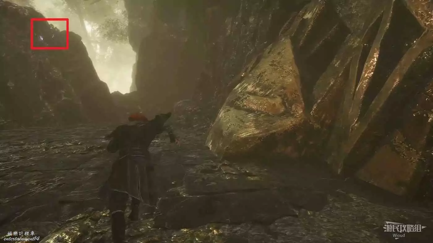 轉頭往後看,中間大石頭左側找到第二個能量塊。