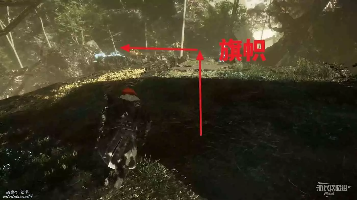 往左走一段距離右拐有個畫框,中間畫面會變黑白,可以看到前方有個旗幟,先無視,穿過畫框立刻往左走。