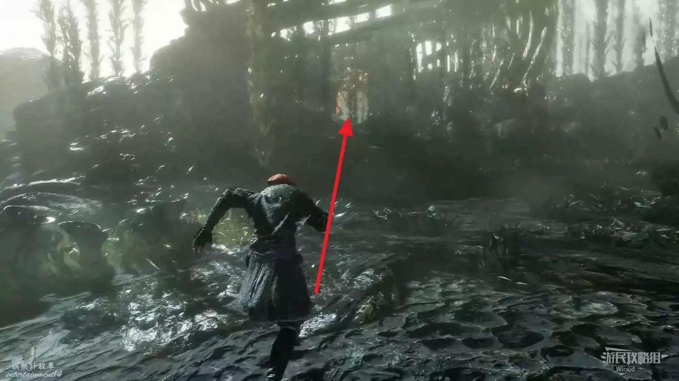 旗幟位置往左走,盡頭處可以看到一個魚骨殘骸入口,往裡走穿過幾個鉤爪點。