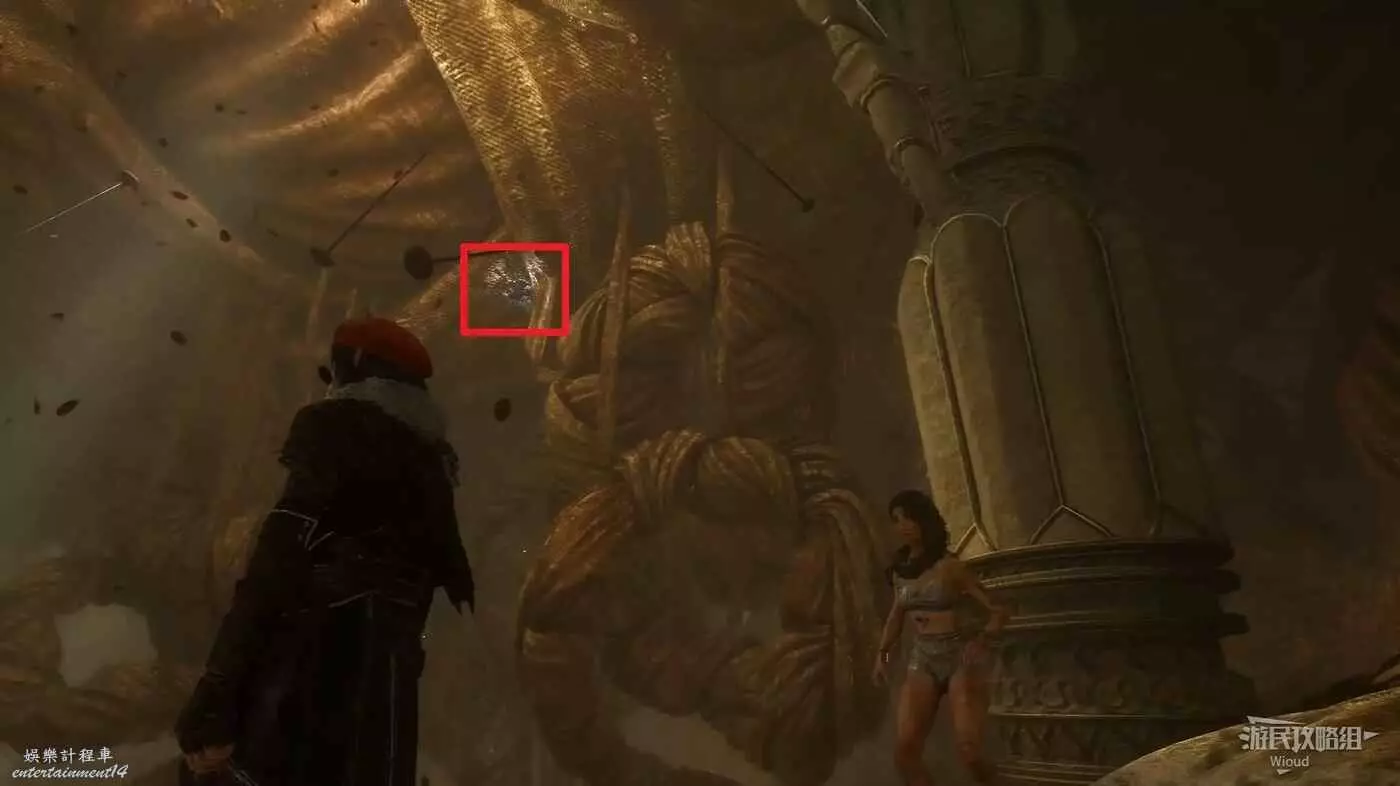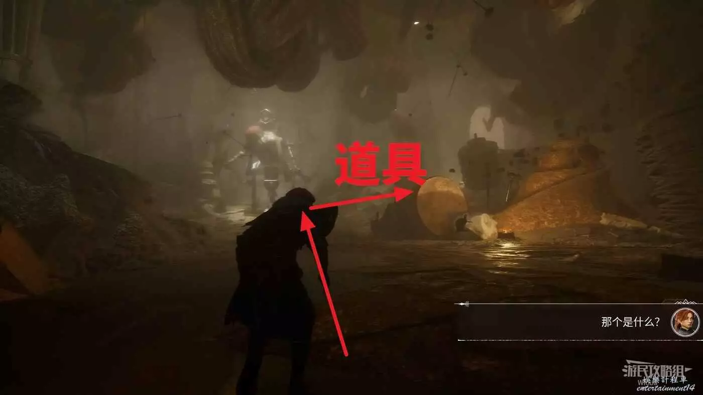 下一個房間可以看到一個巨大的經怪,先直走穿過右側的布料後右拐,盡頭可撿到一些強化道具。