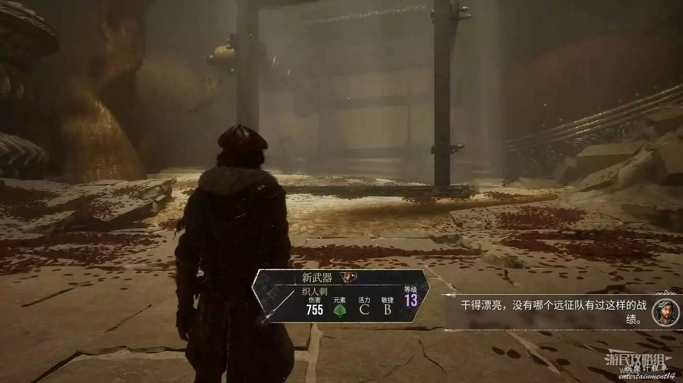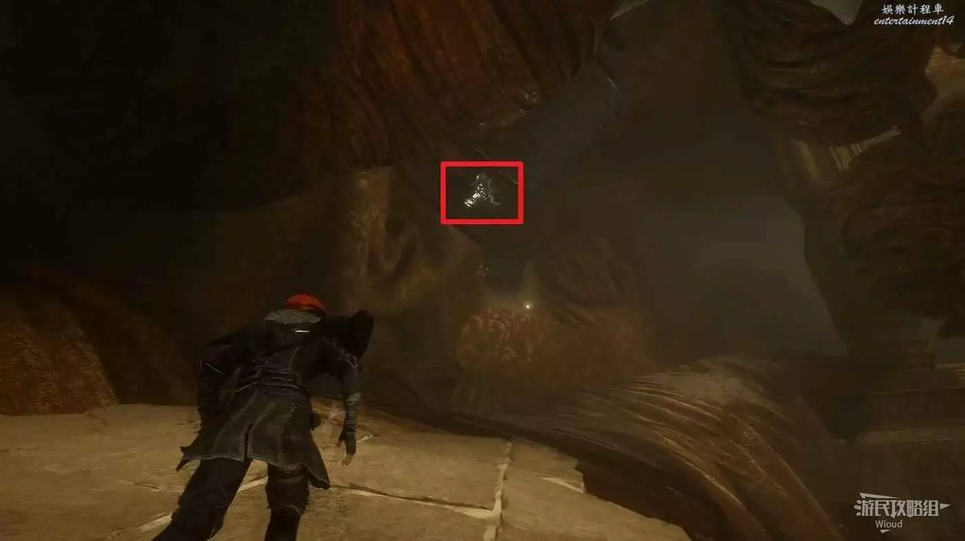 沿路繼續往前走,注意左側有個小道,上面可以撿一個強化材料,跳到底部與巨大經怪互動與其戰鬥。