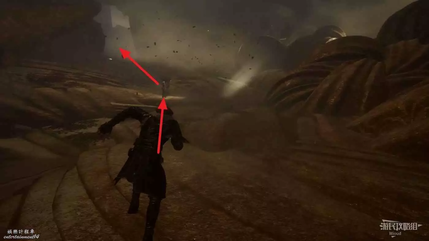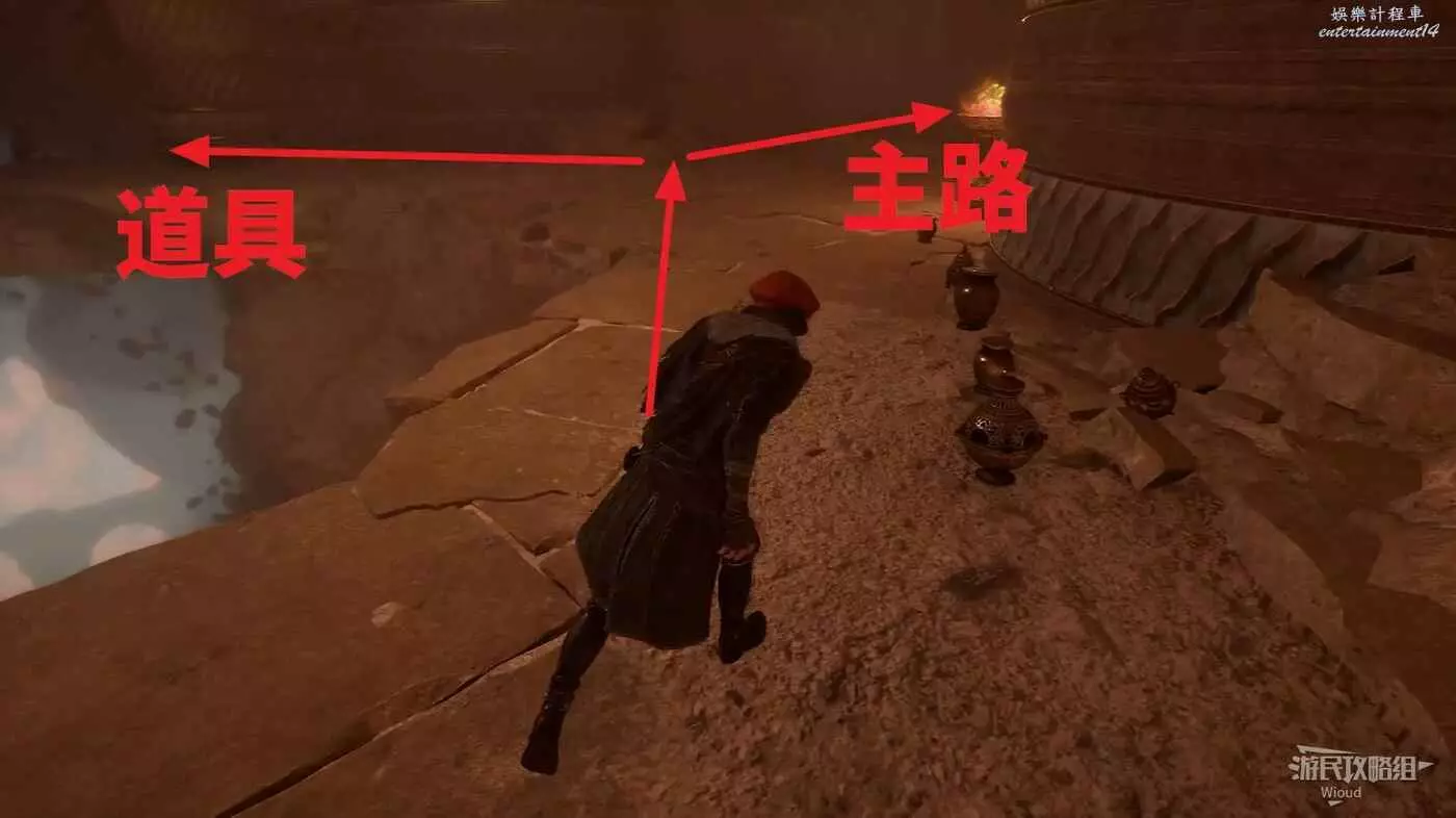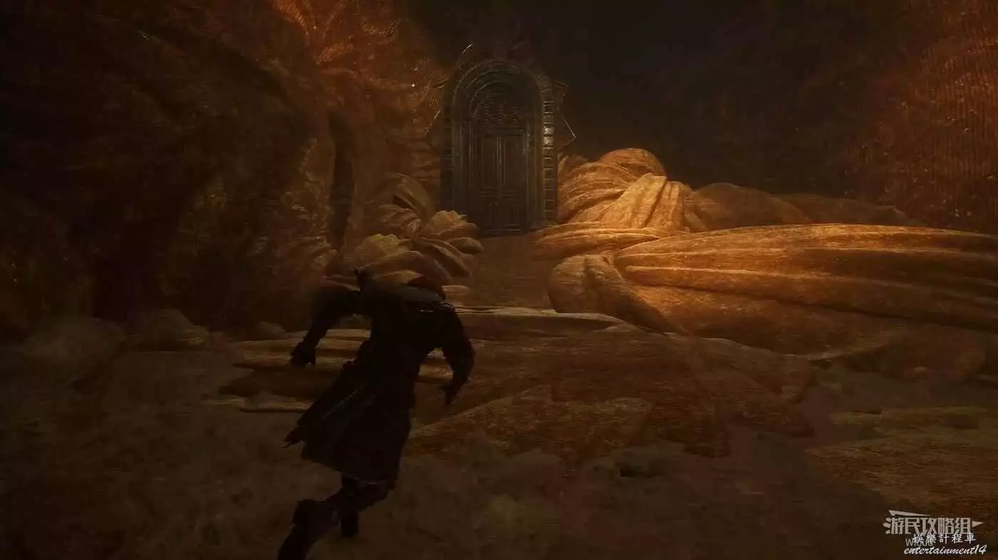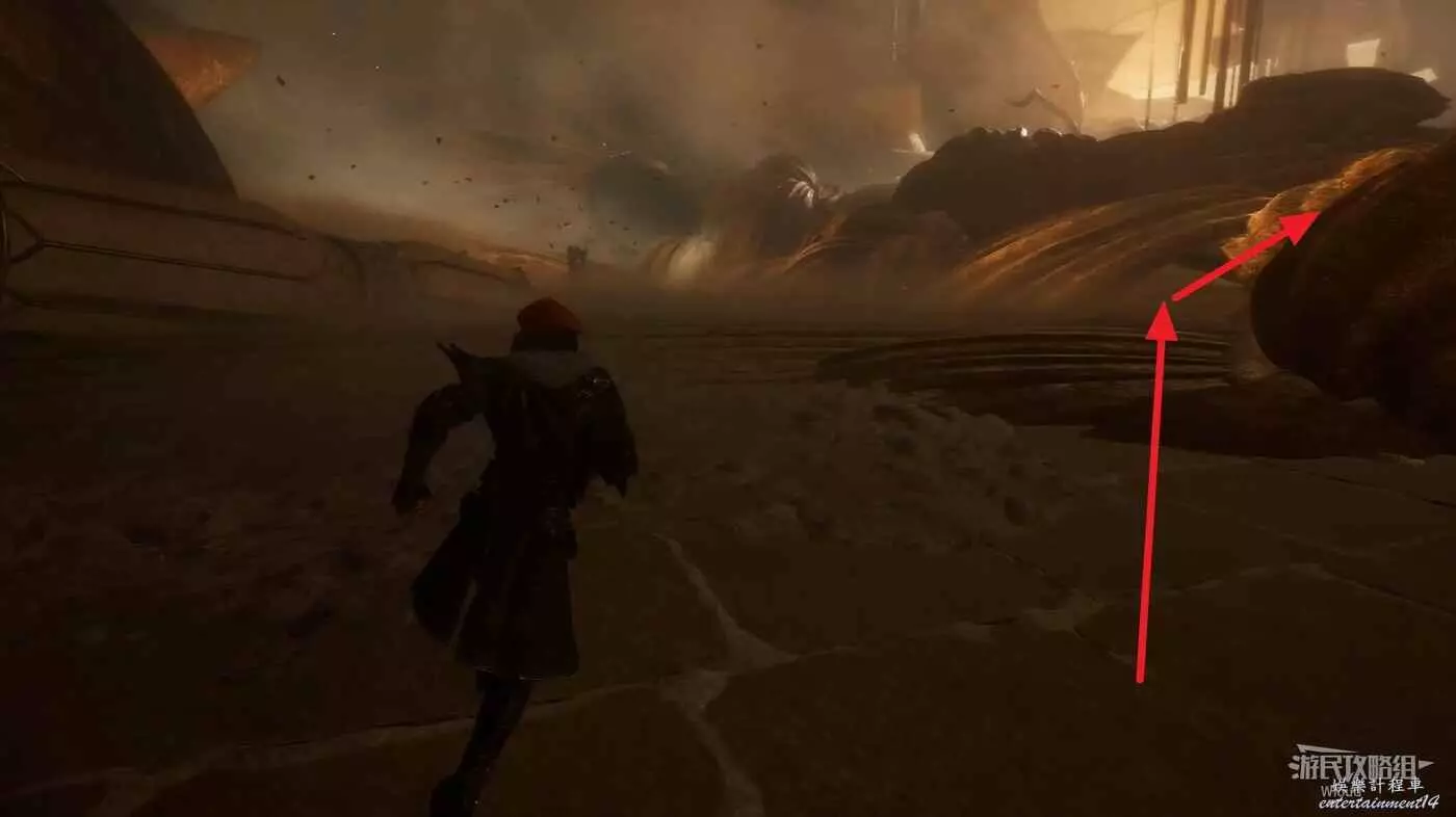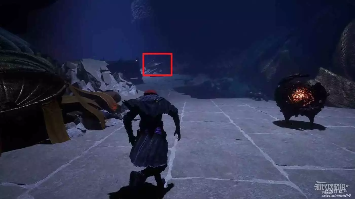 穿過大門即可看到對面的鉤爪點,先無視沿路往裡走,盡頭處有個往上爬的台階,上面可撿到符紋【以死相護】。