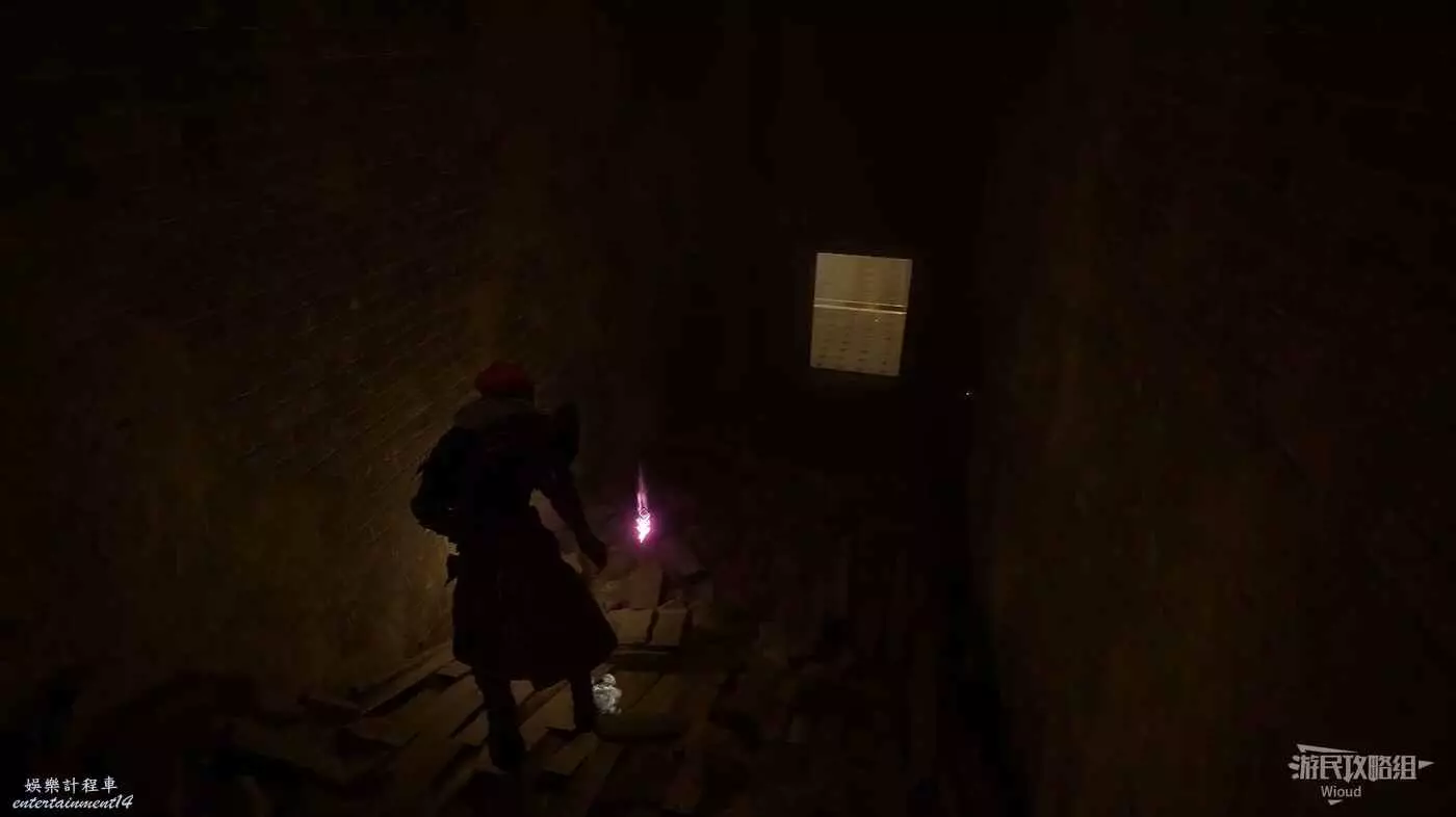 走主路,先與前面黑影對話,往左前方的大門走,大門左側可撿到一個【靈光色】。