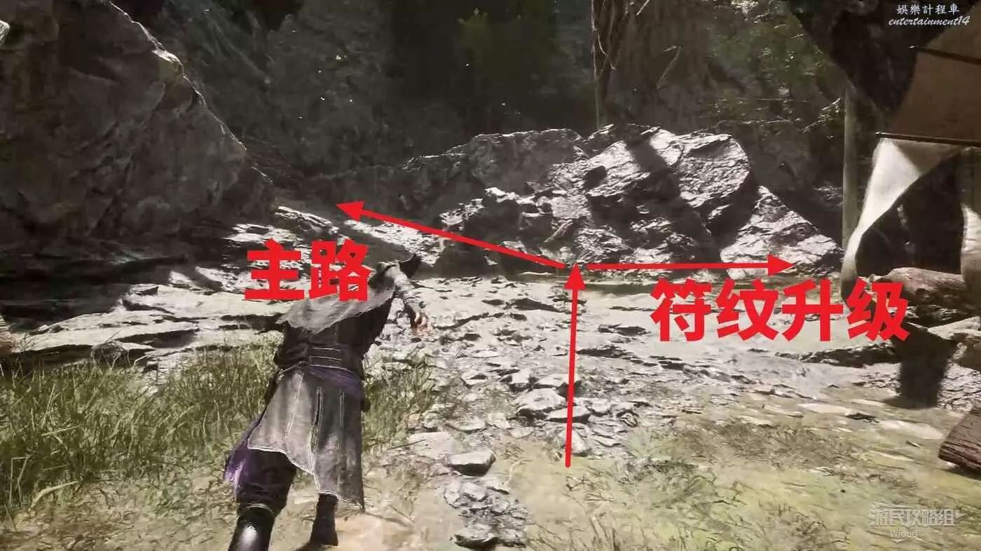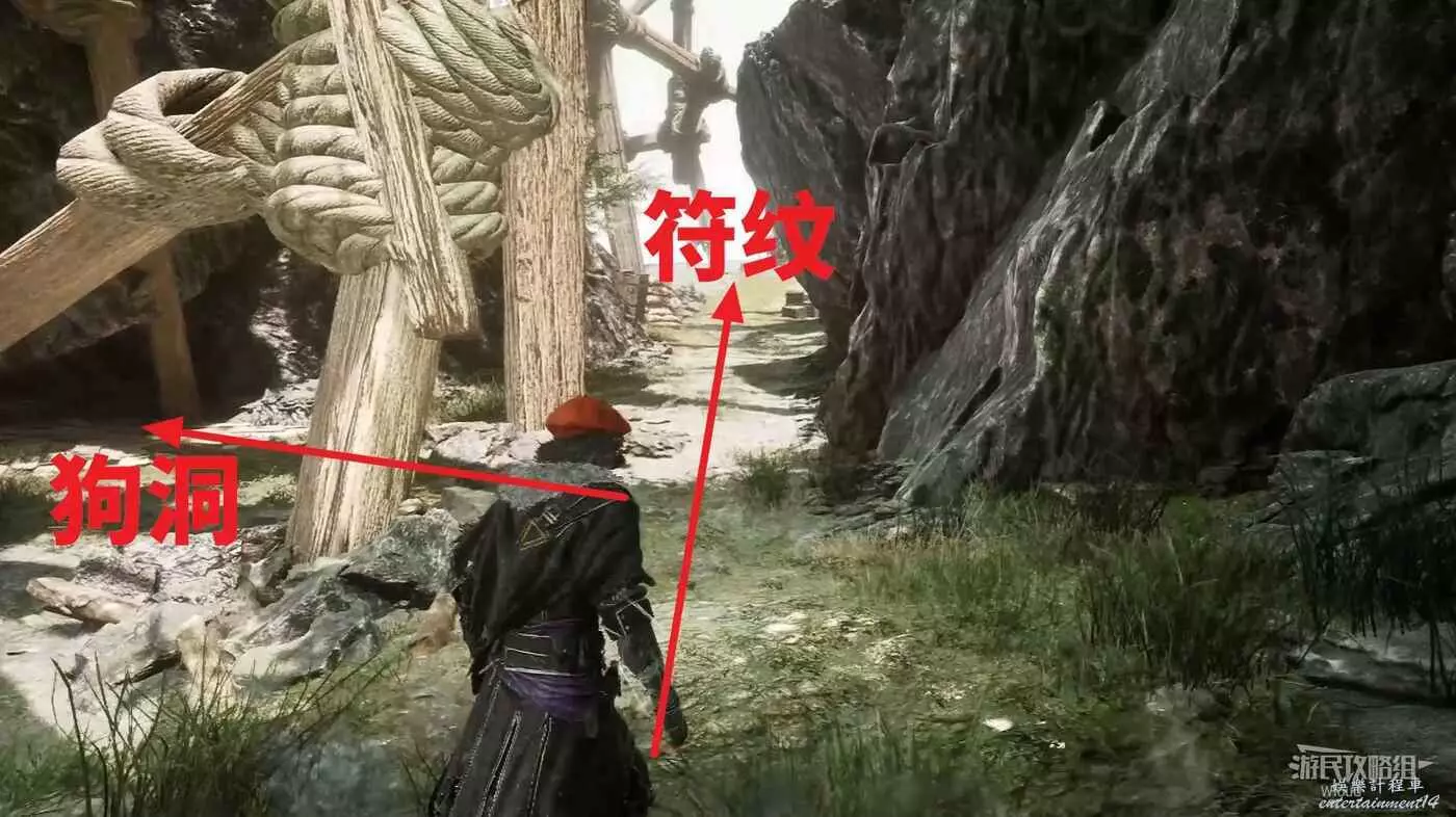 上坡走過去是一個岔路口,右側跳到盡頭平台可升級符紋,走主路到下一個熱氣球前,此處左側有個狗洞可以爬。