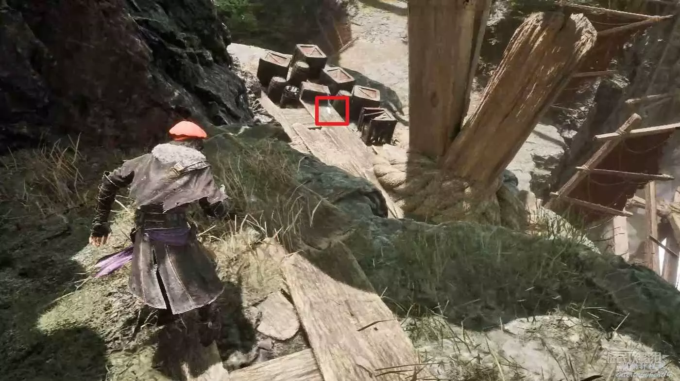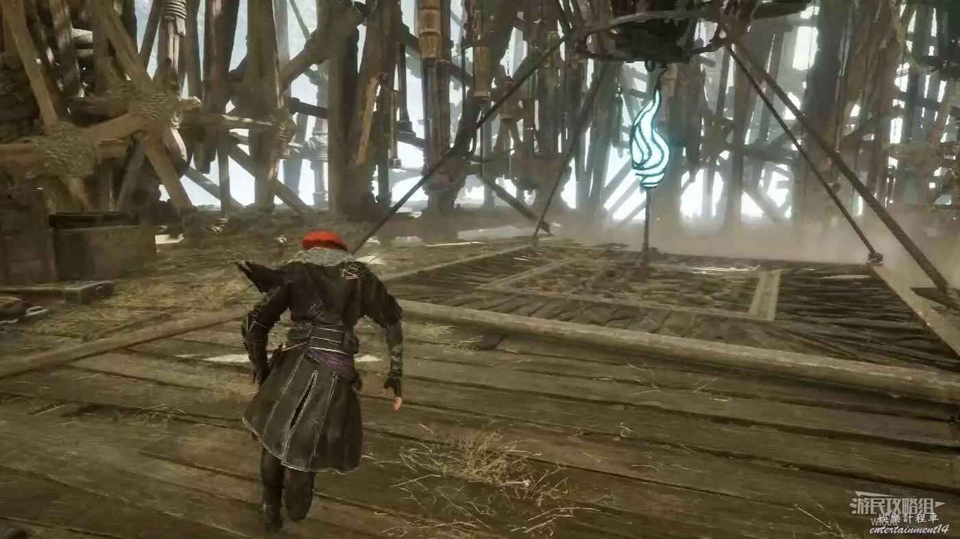 通過鉤爪移動到另一個地方,前方倆怪物右側平台有源色可撿,怪物左側懸崖處有個可對話的NPC。