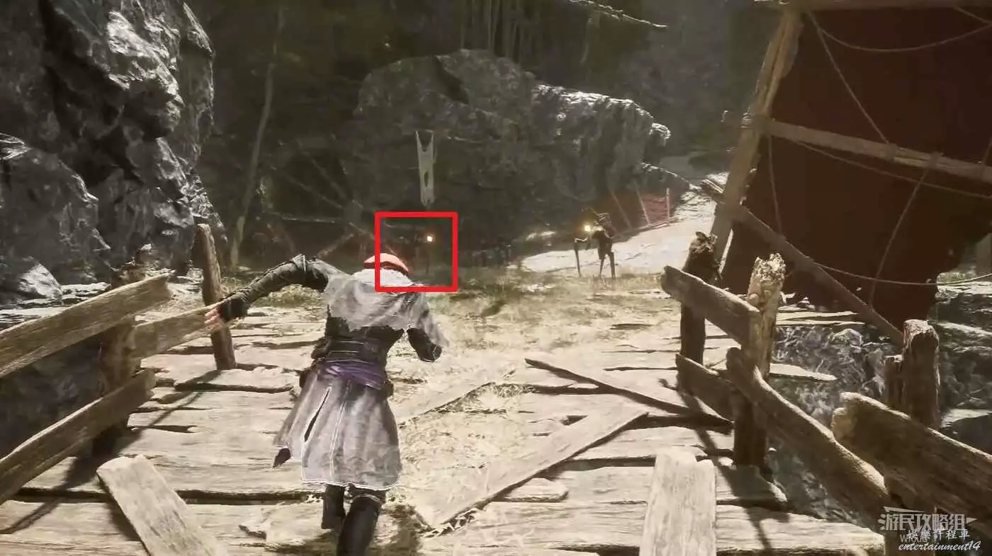 穿過一段木橋,遇到兩個帶燈籠的怪物,將其擊敗可獲得符紋【狙擊手】。