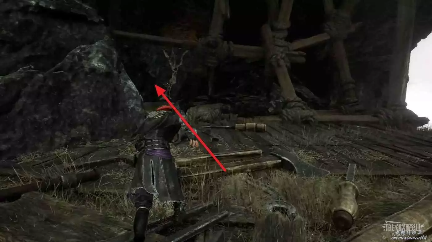 朝NPC右側的木橋走,直到通過一個長距離的鉤爪點,看到前方盡頭有倆怪物。