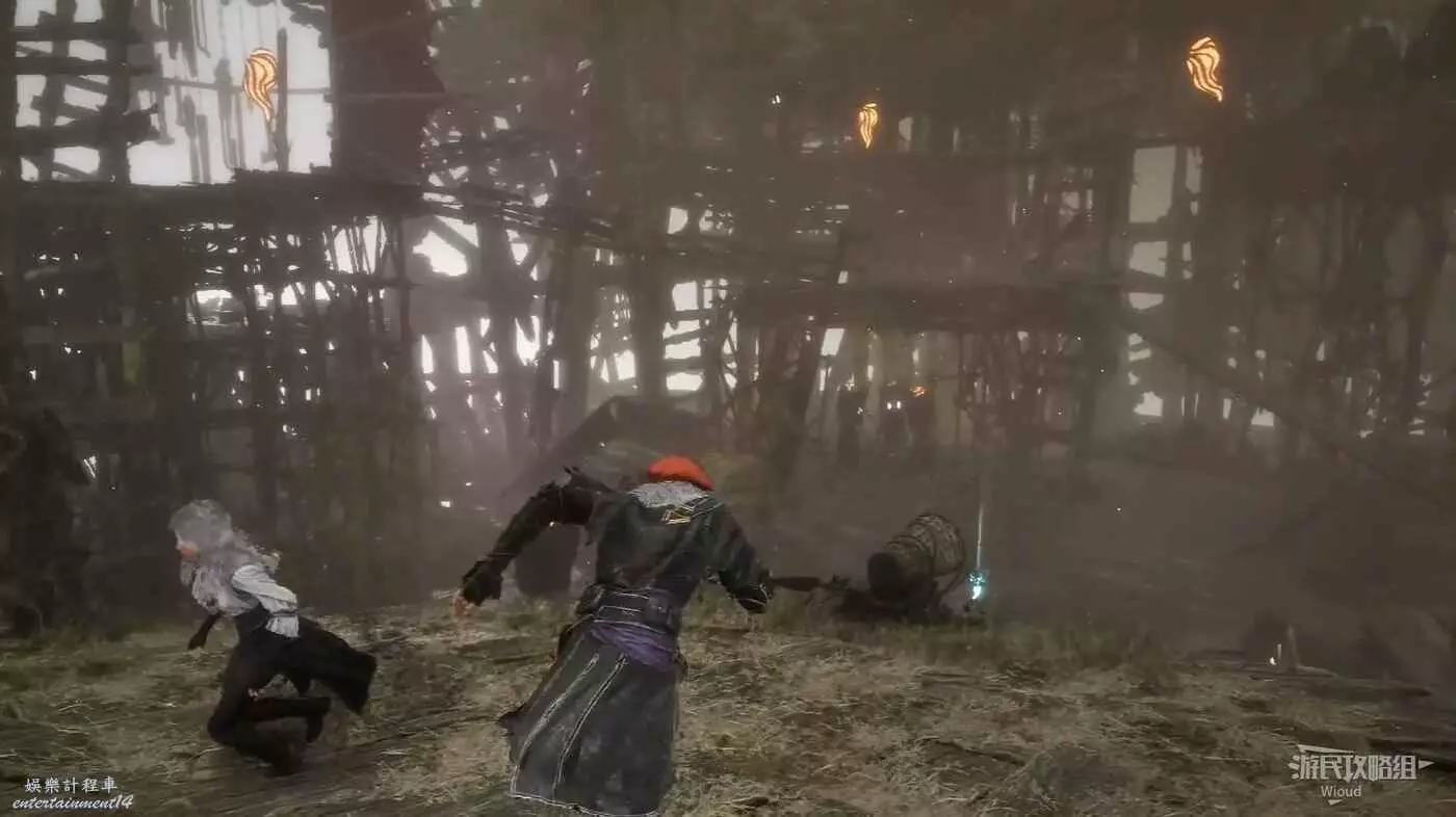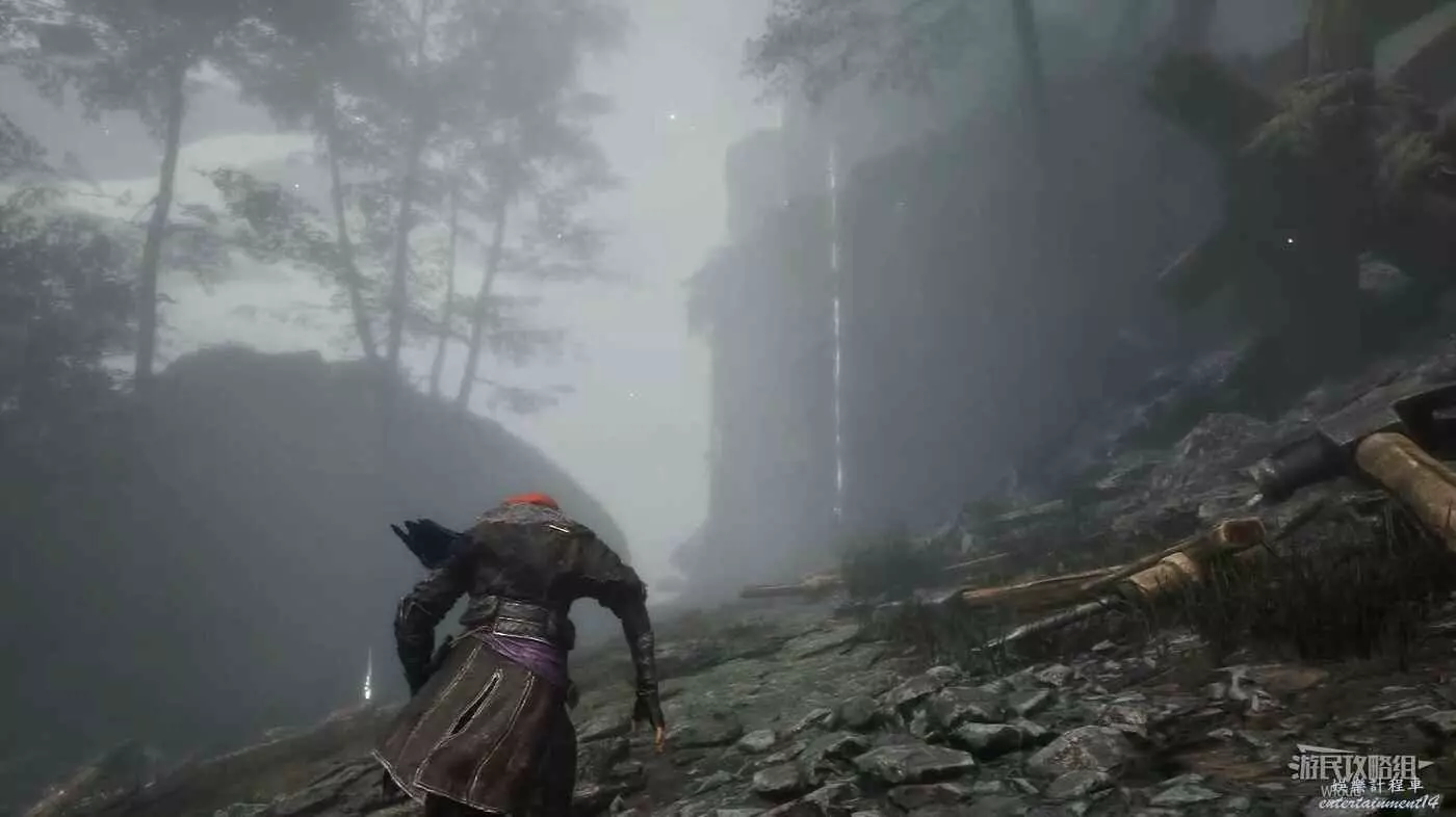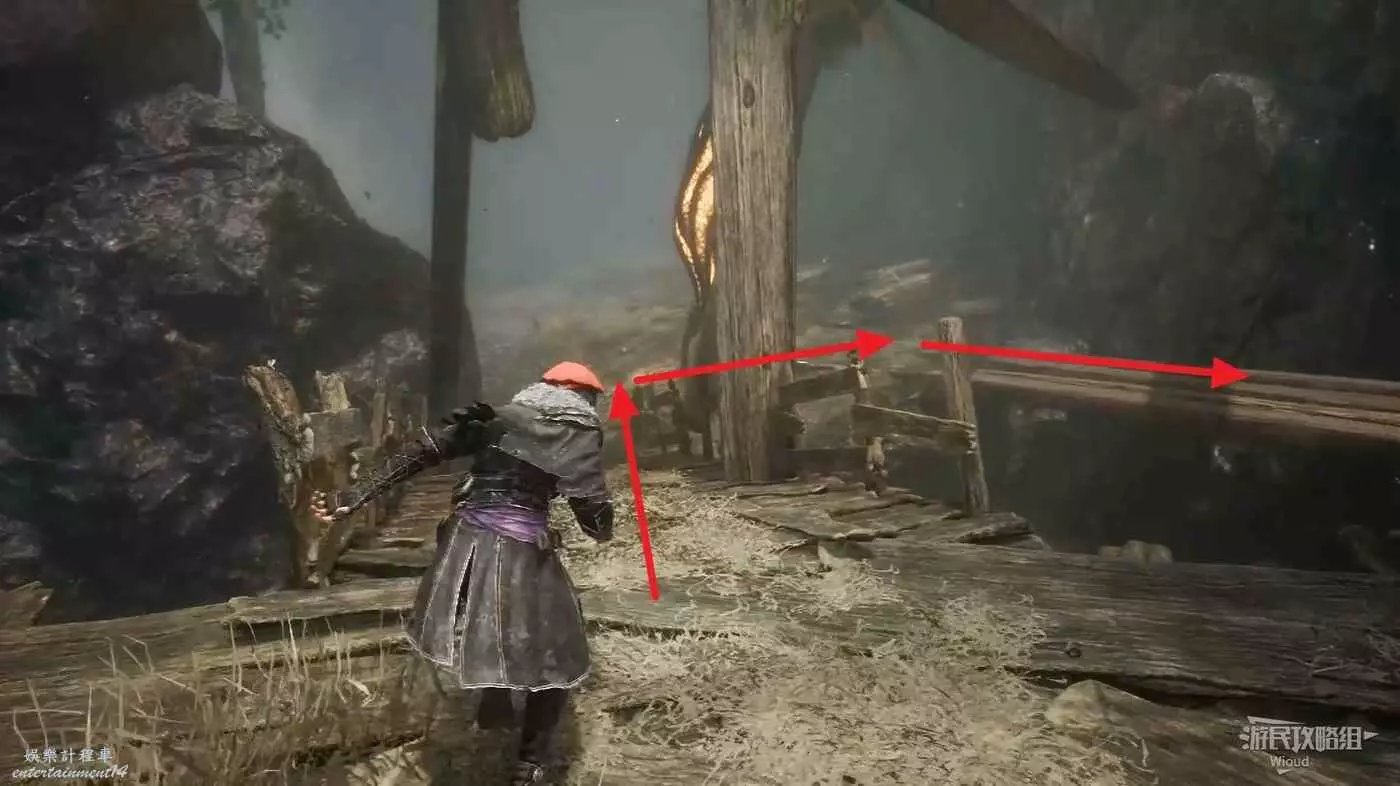 沿路走,穿過一個下坡木橋立刻繞到右後方的獨木橋,盡頭平台可撿到符紋【防護亮色】。